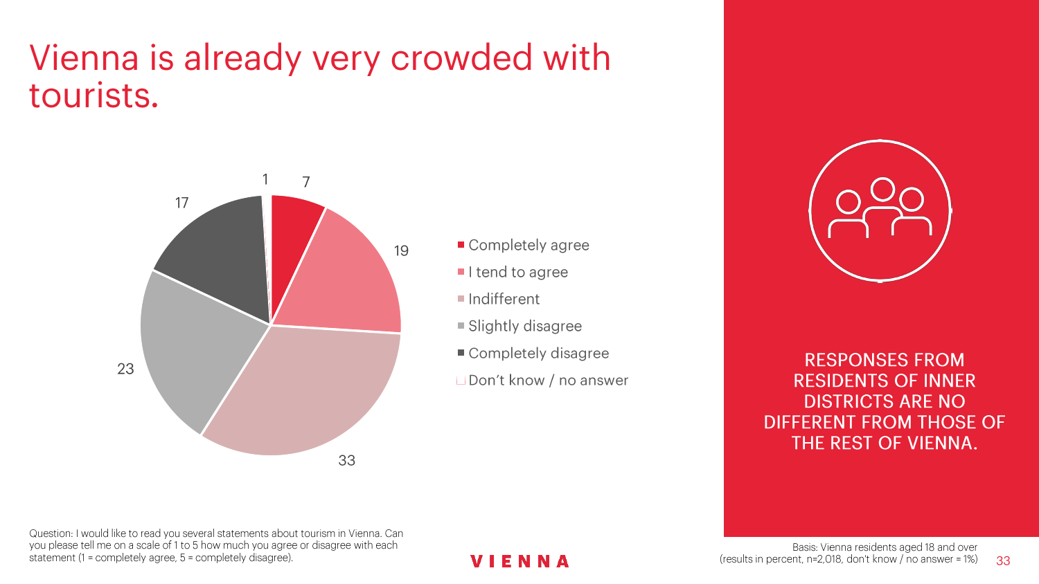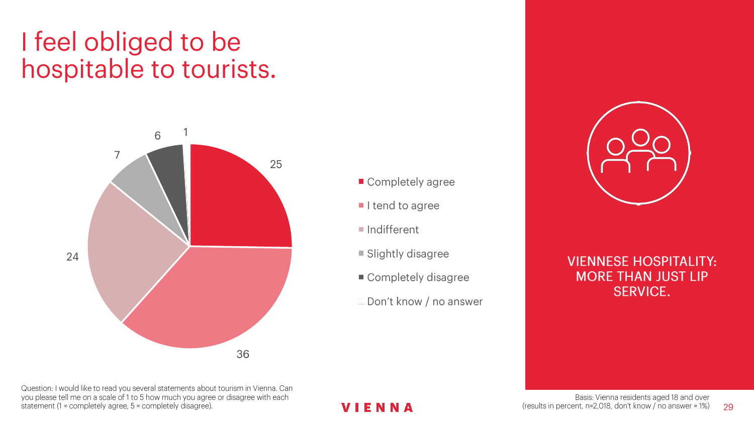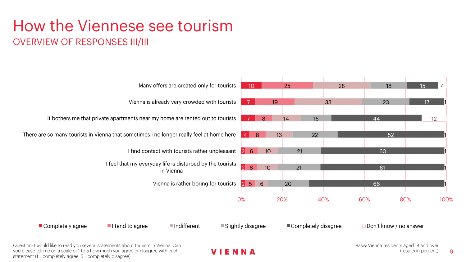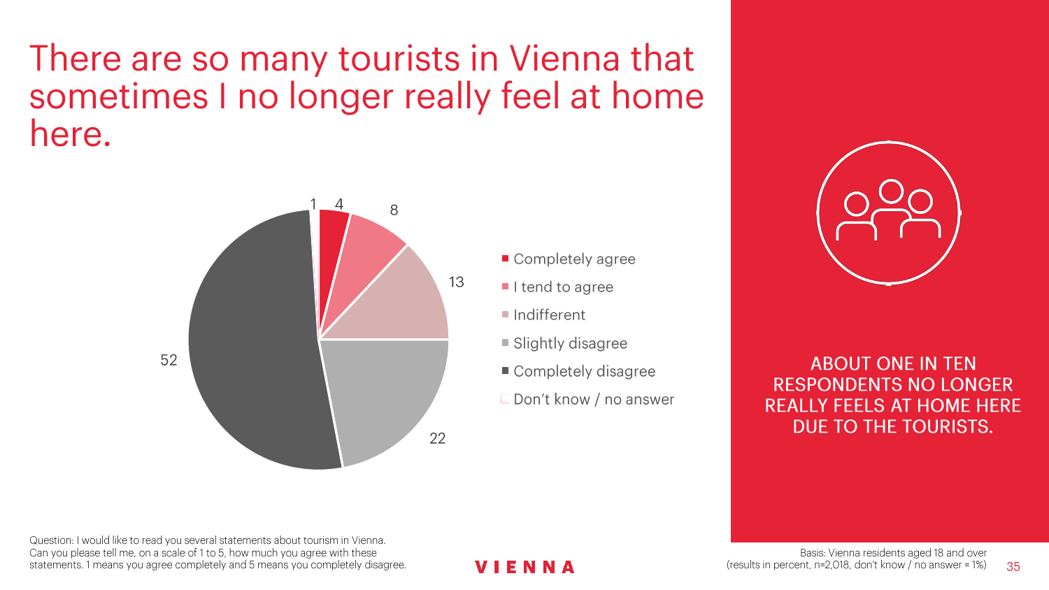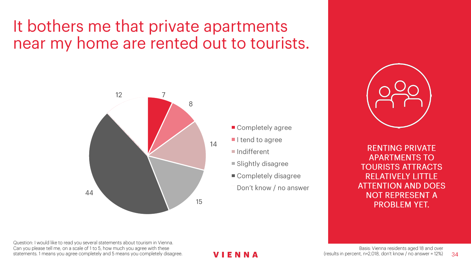 90%的维也纳人都认为,维也纳这座城市及其居民和企业都受益于旅游业。88%的受访者更是指出交易会和大型会议乃是维也纳旅游业的关键成功因素。在回答日常生活是否为游客所打扰这一问题时,82%的受访者给出了否定的答案。绝大多数(89%)受访者都确定旅游业是维也纳的重要经济因素。维也纳人现在还没有把将私人公寓租给游客视为严重问题;59%的受访者表示,出租其住宅附近的私人公寓没有对他们带来困扰,不过将其视为问题的受访者的比例也达到了15%。维也纳旅游局局长诺伯特-克特勒(Norbert Kettner)表示:“维也纳市政府就住宿提供者的权利和义务,以及房东和网络平台需要承担登记地址与详细联系方式方面的法律义务,开展了信息宣传活动,这颇有先见之明。”