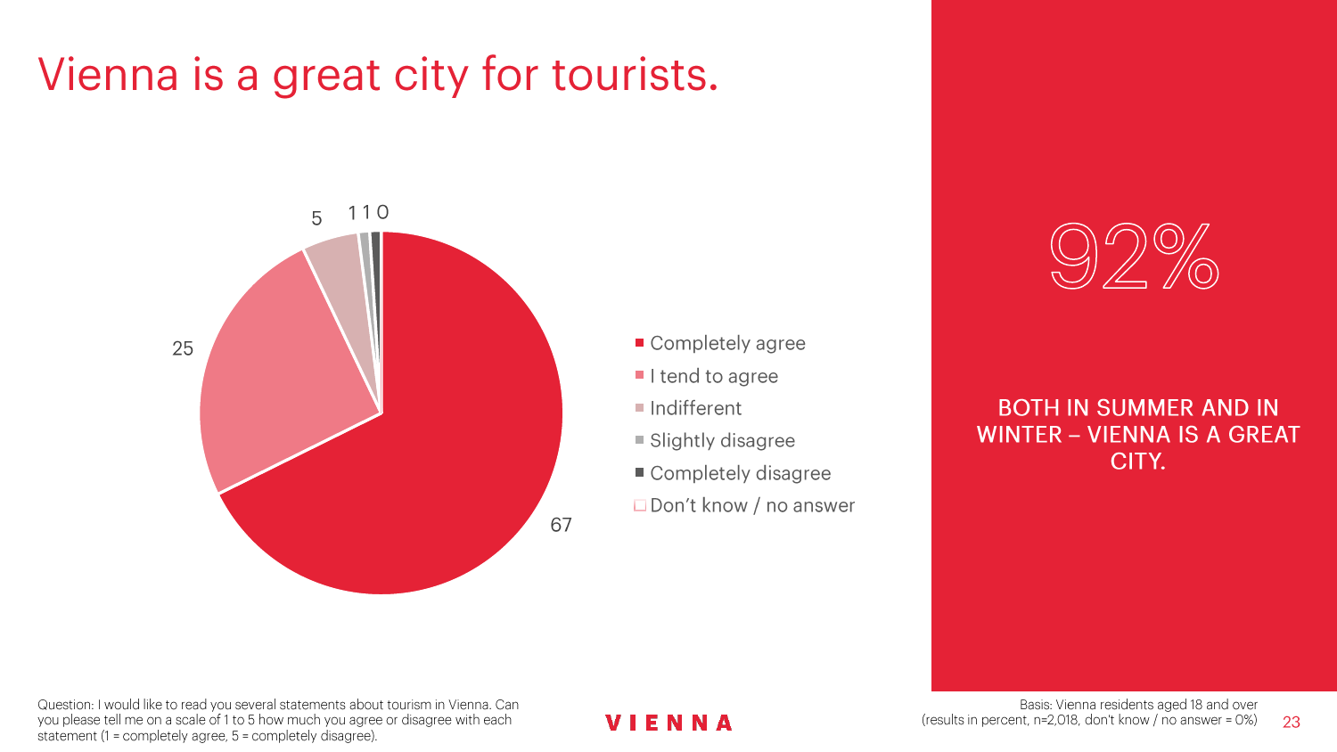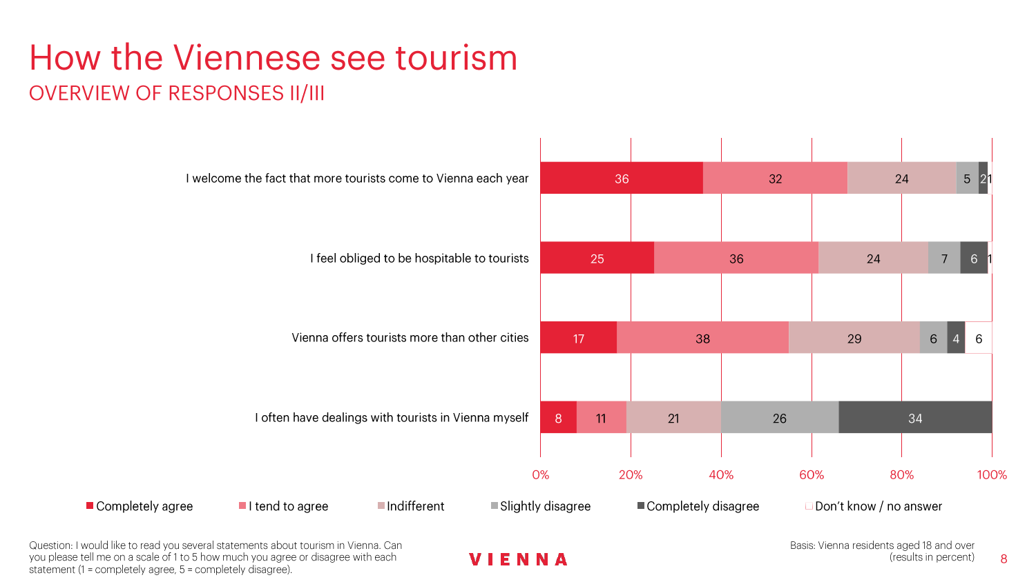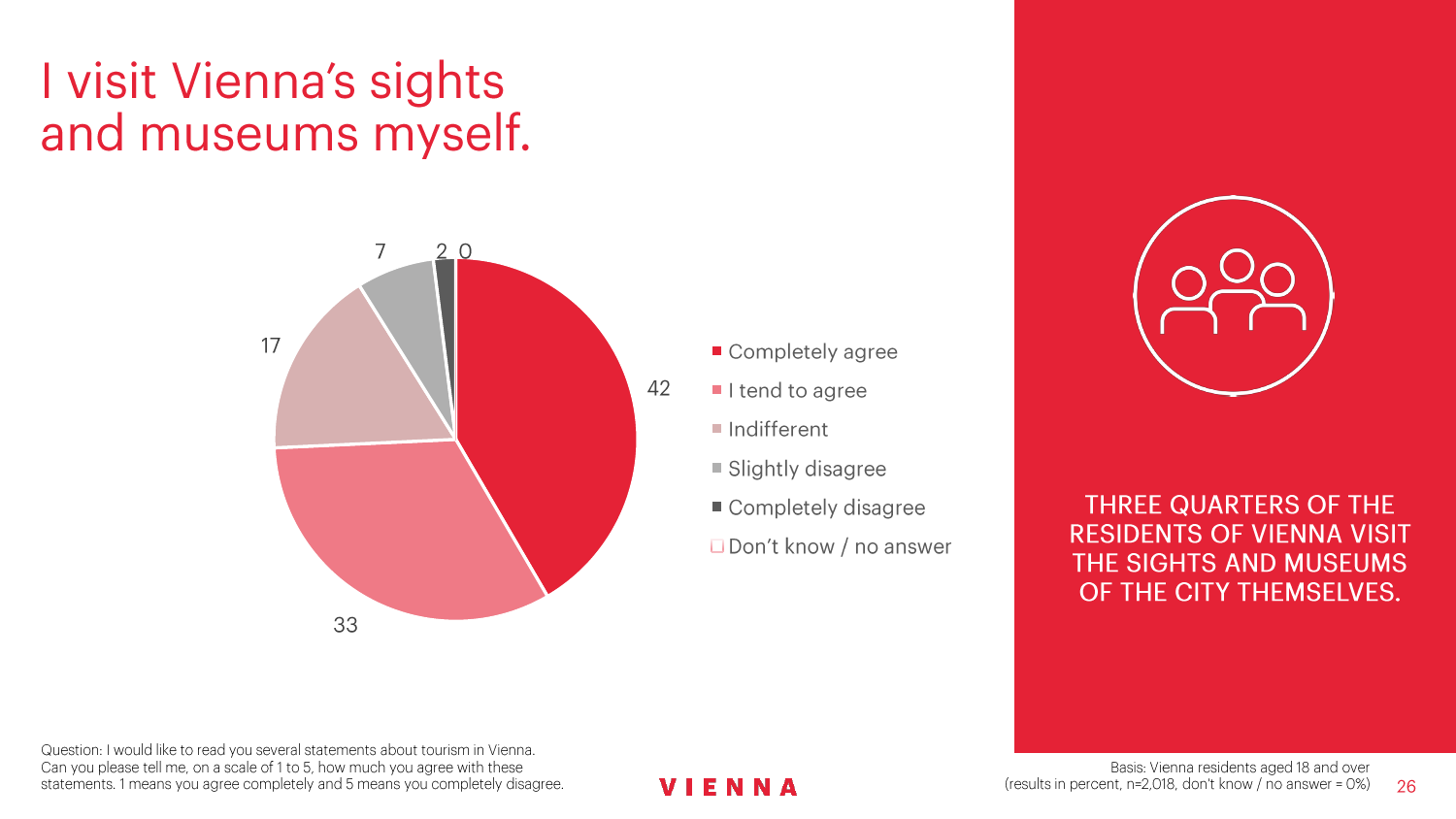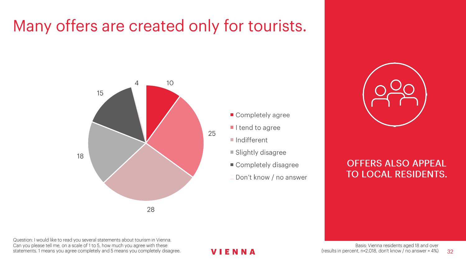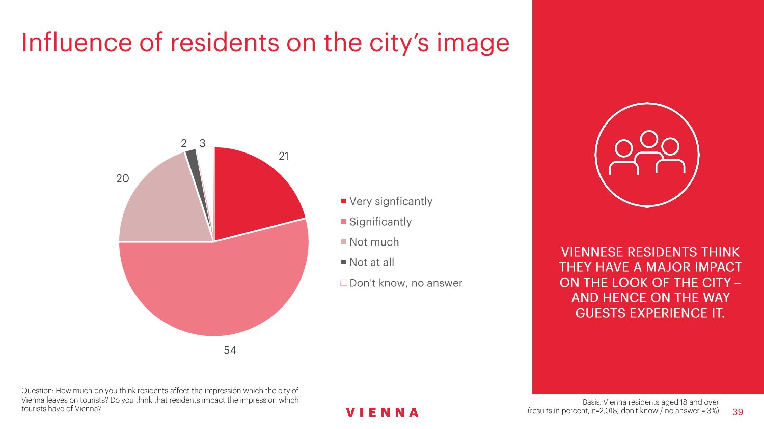 90%的维也纳人都认为,维也纳这座城市及其居民和企业都受益于旅游业。88%的受访者更是指出交易会和大型会议乃是维也纳旅游业的关键成功因素。在回答日常生活是否为游客所打扰这一问题时,82%的受访者给出了否定的答案。绝大多数(89%)受访者都确定旅游业是维也纳的重要经济因素。维也纳人现在还没有把将私人公寓租给游客视为严重问题;59%的受访者表示,出租其住宅附近的私人公寓没有对他们带来困扰,不过将其视为问题的受访者的比例也达到了15%。维也纳旅游局局长诺伯特-克特勒(Norbert Kettner)表示:“维也纳市政府就住宿提供者的权利和义务,以及房东和网络平台需要承担登记地址与详细联系方式方面的法律义务,开展了信息宣传活动,这颇有先见之明。”