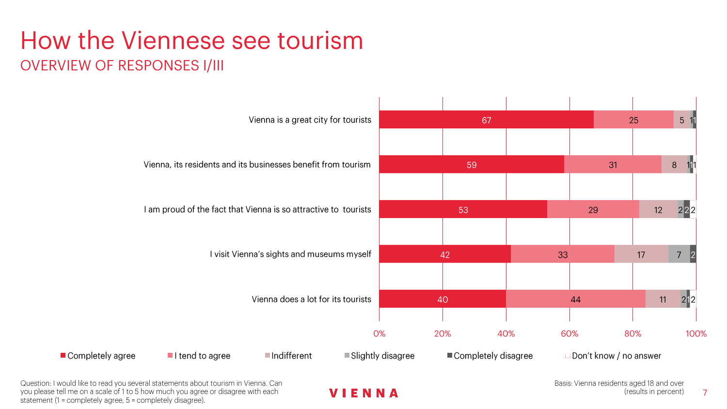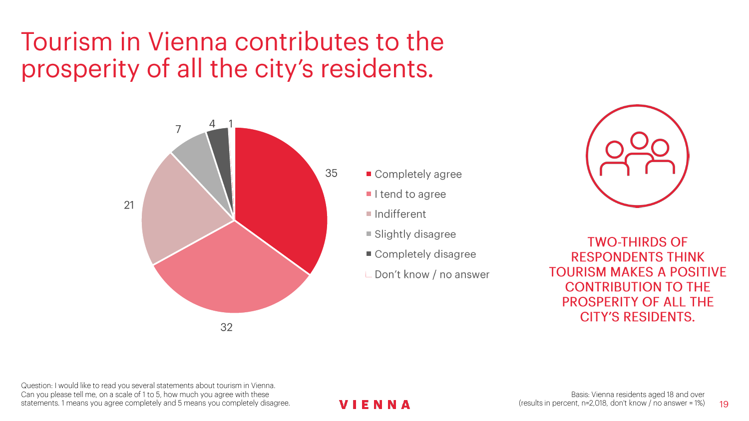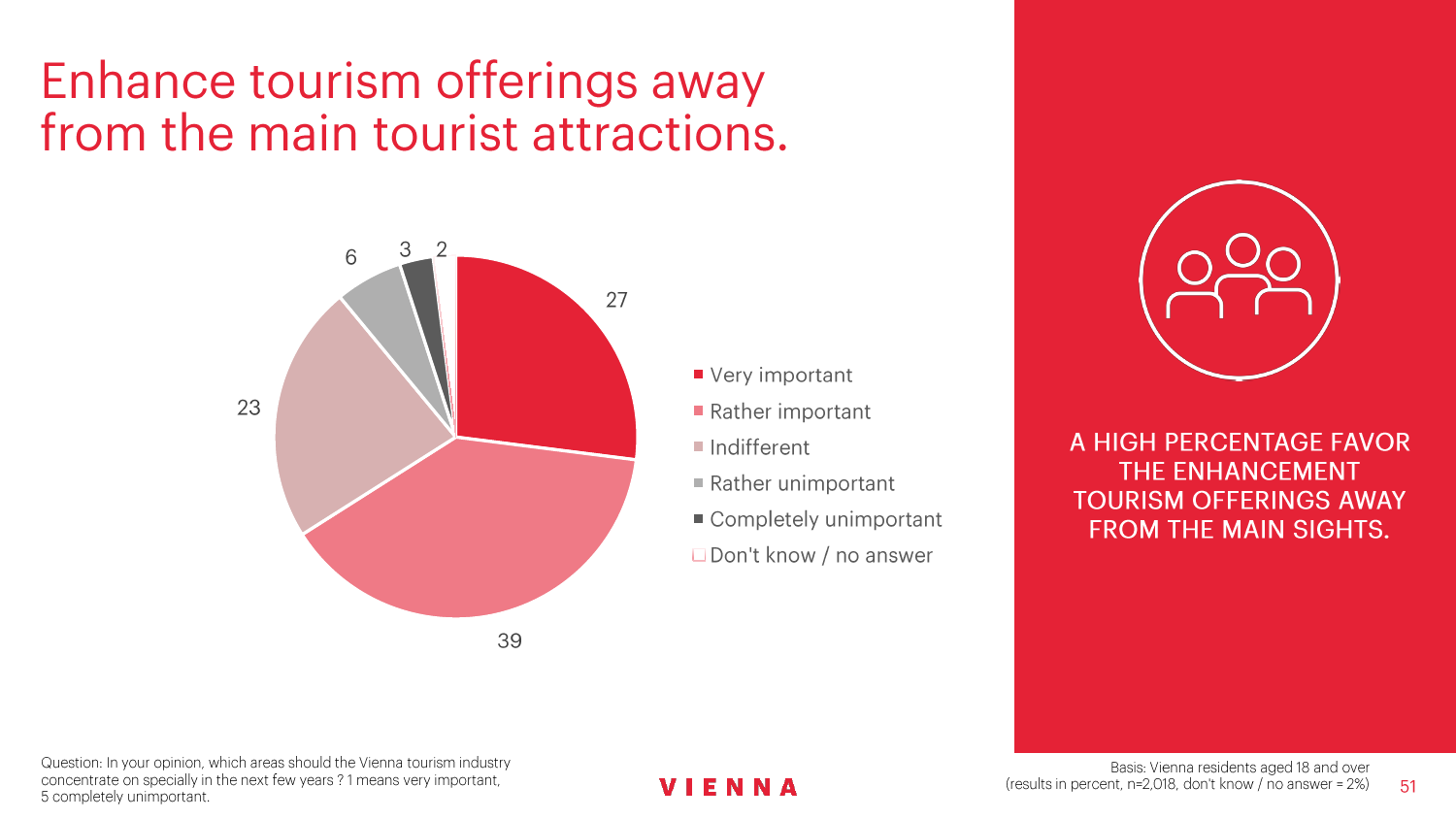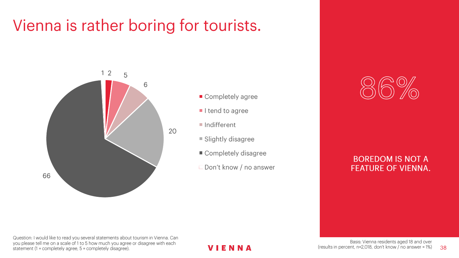 90%的维也纳人都认为,维也纳这座城市及其居民和企业都受益于旅游业。88%的受访者更是指出交易会和大型会议乃是维也纳旅游业的关键成功因素。在回答日常生活是否为游客所打扰这一问题时,82%的受访者给出了否定的答案。绝大多数(89%)受访者都确定旅游业是维也纳的重要经济因素。维也纳人现在还没有把将私人公寓租给游客视为严重问题;59%的受访者表示,出租其住宅附近的私人公寓没有对他们带来困扰,不过将其视为问题的受访者的比例也达到了15%。维也纳旅游局局长诺伯特-克特勒(Norbert Kettner)表示:“维也纳市政府就住宿提供者的权利和义务,以及房东和网络平台需要承担登记地址与详细联系方式方面的法律义务,开展了信息宣传活动,这颇有先见之明。”