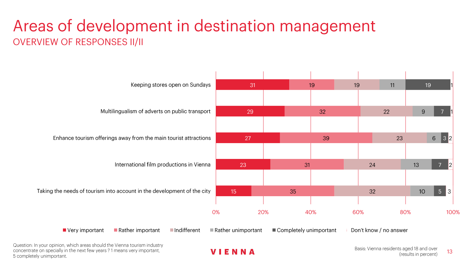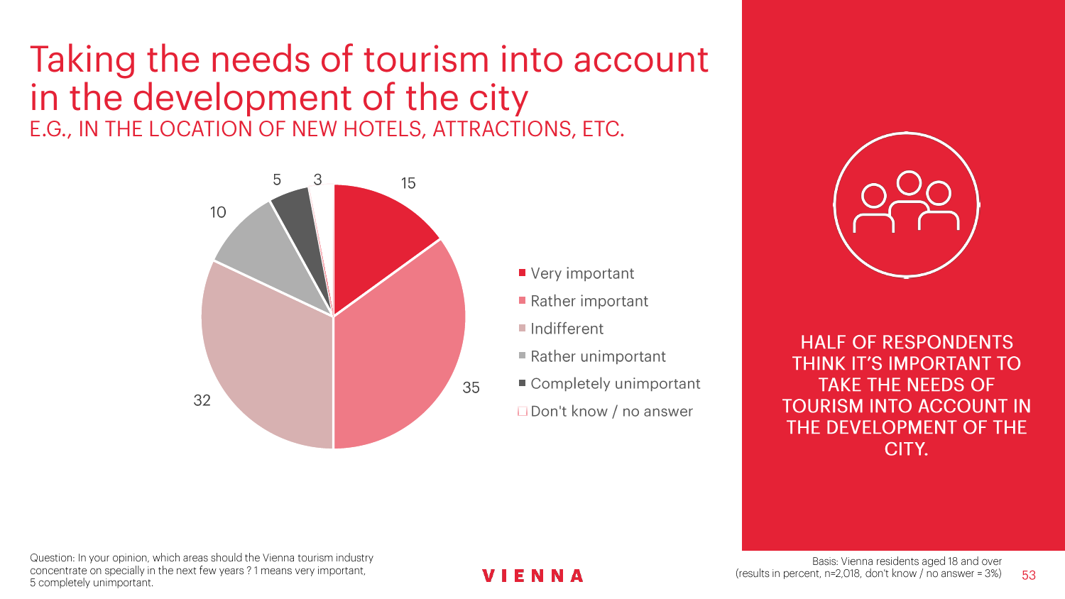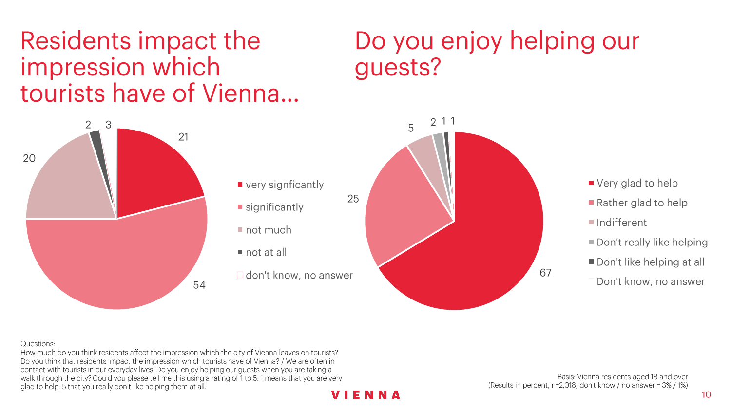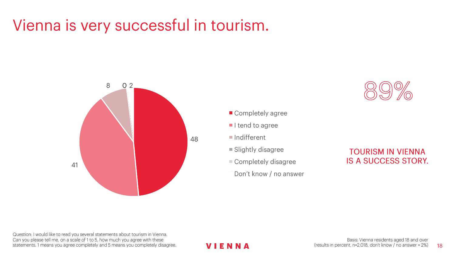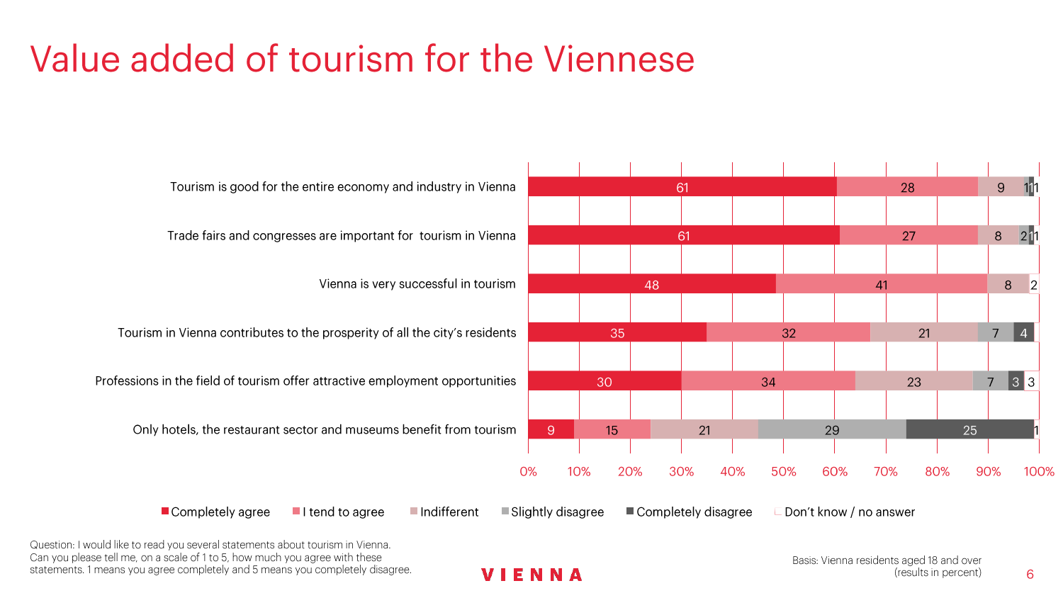 90%的维也纳人都认为,维也纳这座城市及其居民和企业都受益于旅游业。88%的受访者更是指出交易会和大型会议乃是维也纳旅游业的关键成功因素。在回答日常生活是否为游客所打扰这一问题时,82%的受访者给出了否定的答案。绝大多数(89%)受访者都确定旅游业是维也纳的重要经济因素。维也纳人现在还没有把将私人公寓租给游客视为严重问题;59%的受访者表示,出租其住宅附近的私人公寓没有对他们带来困扰,不过将其视为问题的受访者的比例也达到了15%。维也纳旅游局局长诺伯特-克特勒(Norbert Kettner)表示:“维也纳市政府就住宿提供者的权利和义务,以及房东和网络平台需要承担登记地址与详细联系方式方面的法律义务,开展了信息宣传活动,这颇有先见之明。”