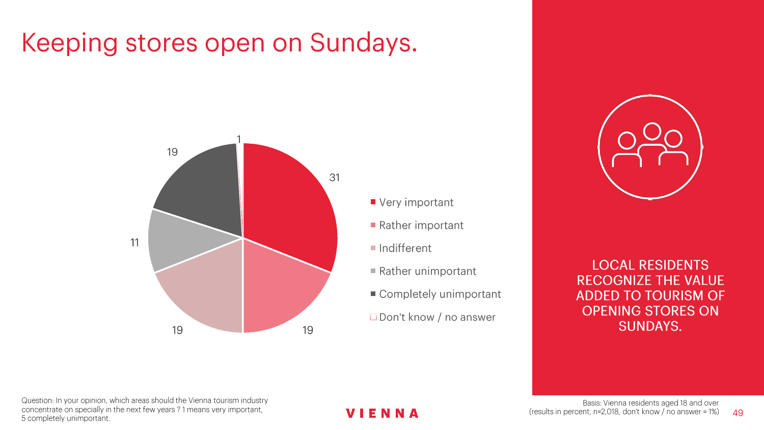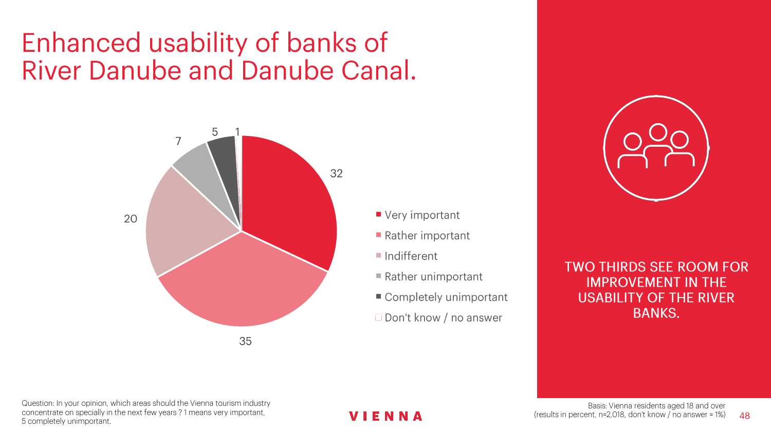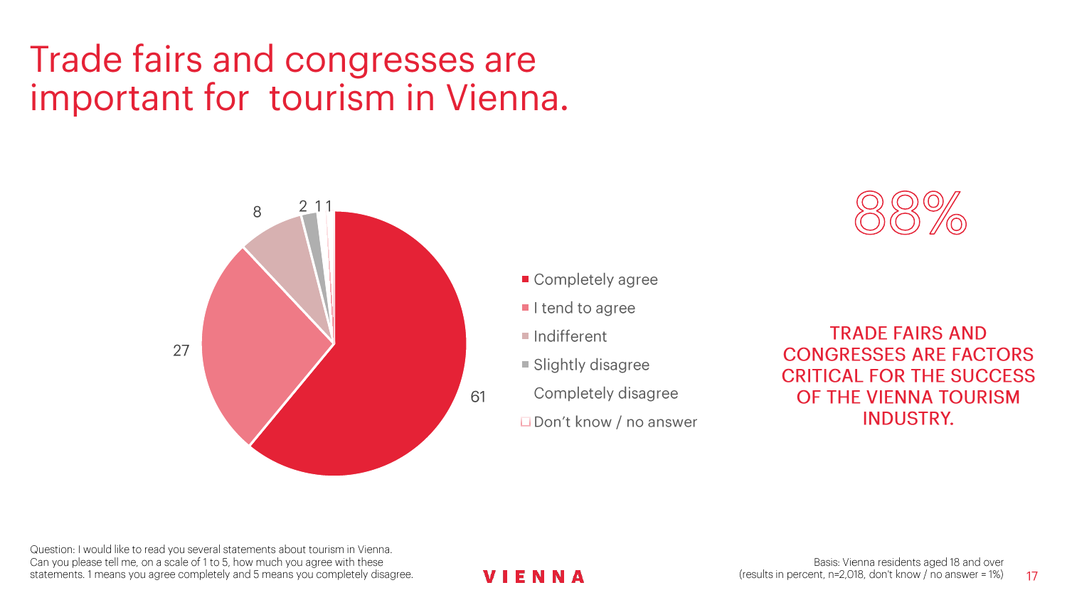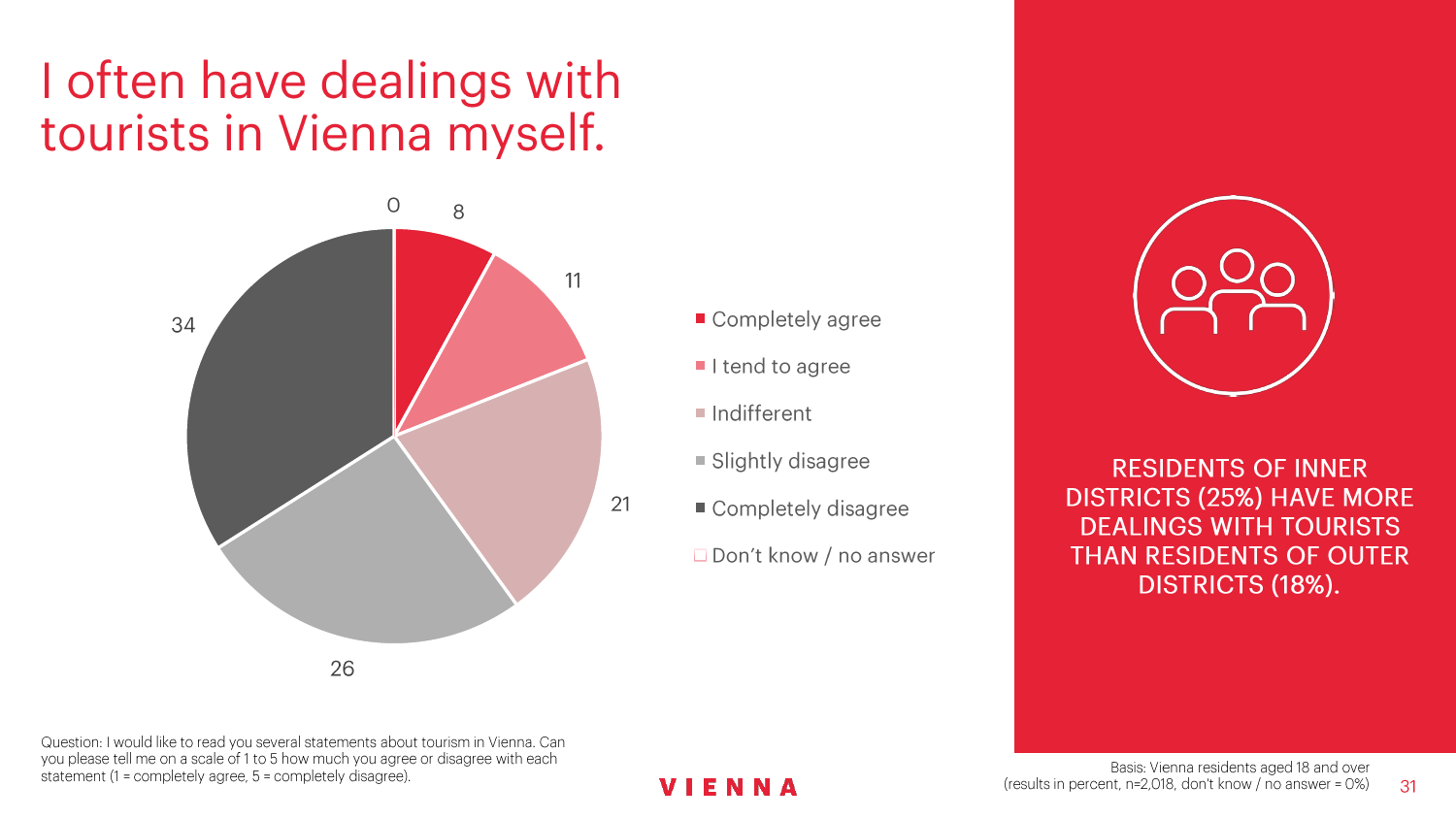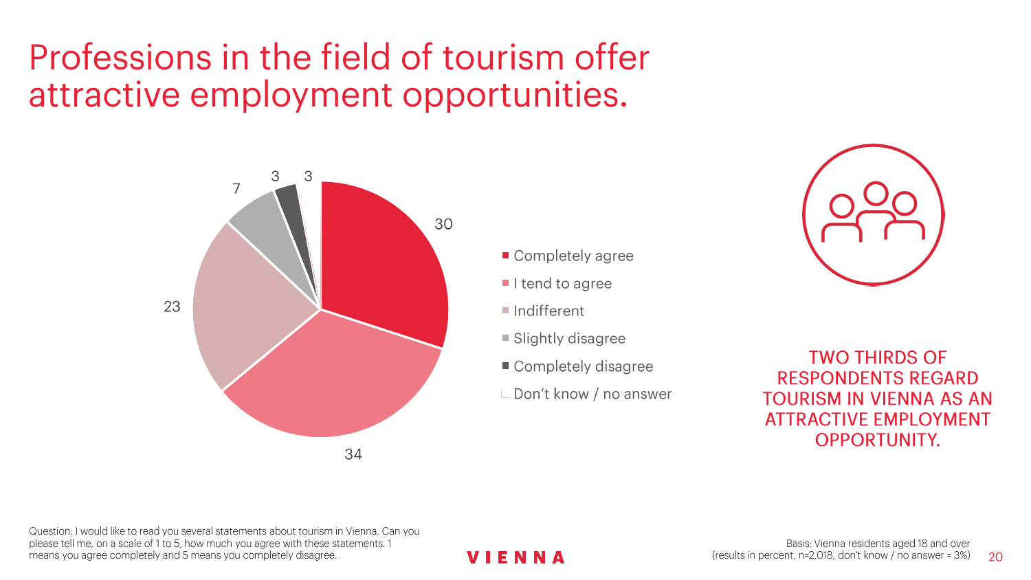 90%的维也纳人都认为,维也纳这座城市及其居民和企业都受益于旅游业。88%的受访者更是指出交易会和大型会议乃是维也纳旅游业的关键成功因素。在回答日常生活是否为游客所打扰这一问题时,82%的受访者给出了否定的答案。绝大多数(89%)受访者都确定旅游业是维也纳的重要经济因素。维也纳人现在还没有把将私人公寓租给游客视为严重问题;59%的受访者表示,出租其住宅附近的私人公寓没有对他们带来困扰,不过将其视为问题的受访者的比例也达到了15%。维也纳旅游局局长诺伯特-克特勒(Norbert Kettner)表示:“维也纳市政府就住宿提供者的权利和义务,以及房东和网络平台需要承担登记地址与详细联系方式方面的法律义务,开展了信息宣传活动,这颇有先见之明。”