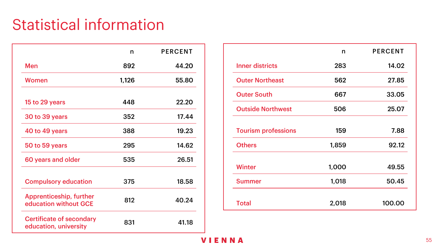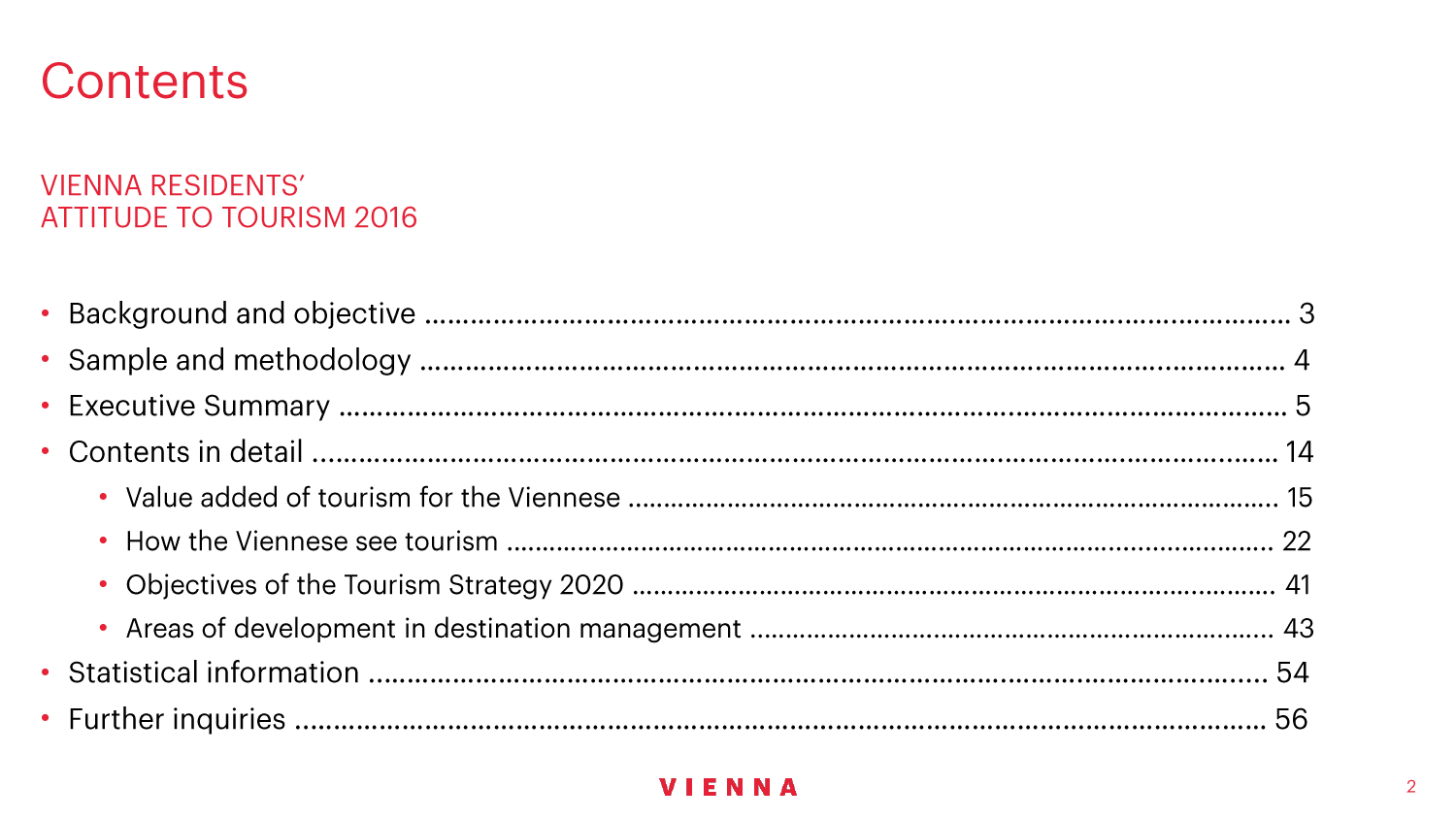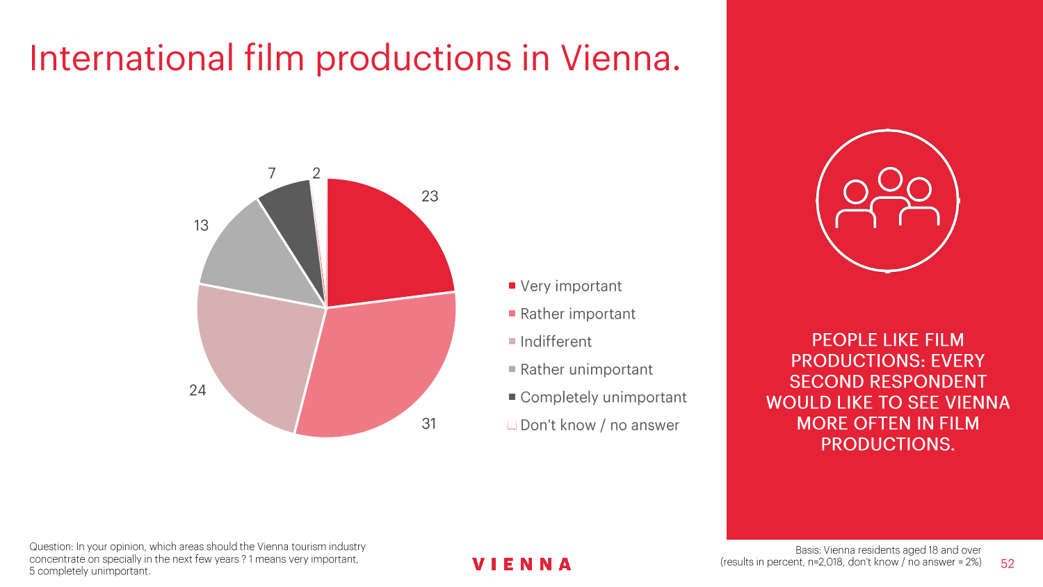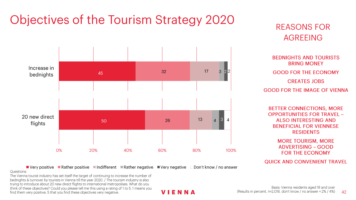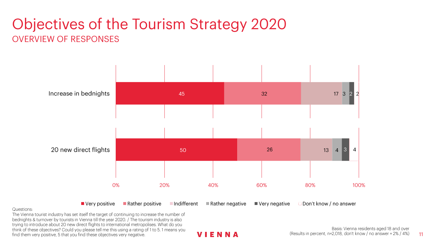 90%的维也纳人都认为,维也纳这座城市及其居民和企业都受益于旅游业。88%的受访者更是指出交易会和大型会议乃是维也纳旅游业的关键成功因素。在回答日常生活是否为游客所打扰这一问题时,82%的受访者给出了否定的答案。绝大多数(89%)受访者都确定旅游业是维也纳的重要经济因素。维也纳人现在还没有把将私人公寓租给游客视为严重问题;59%的受访者表示,出租其住宅附近的私人公寓没有对他们带来困扰,不过将其视为问题的受访者的比例也达到了15%。维也纳旅游局局长诺伯特-克特勒(Norbert Kettner)表示:“维也纳市政府就住宿提供者的权利和义务,以及房东和网络平台需要承担登记地址与详细联系方式方面的法律义务,开展了信息宣传活动,这颇有先见之明。”