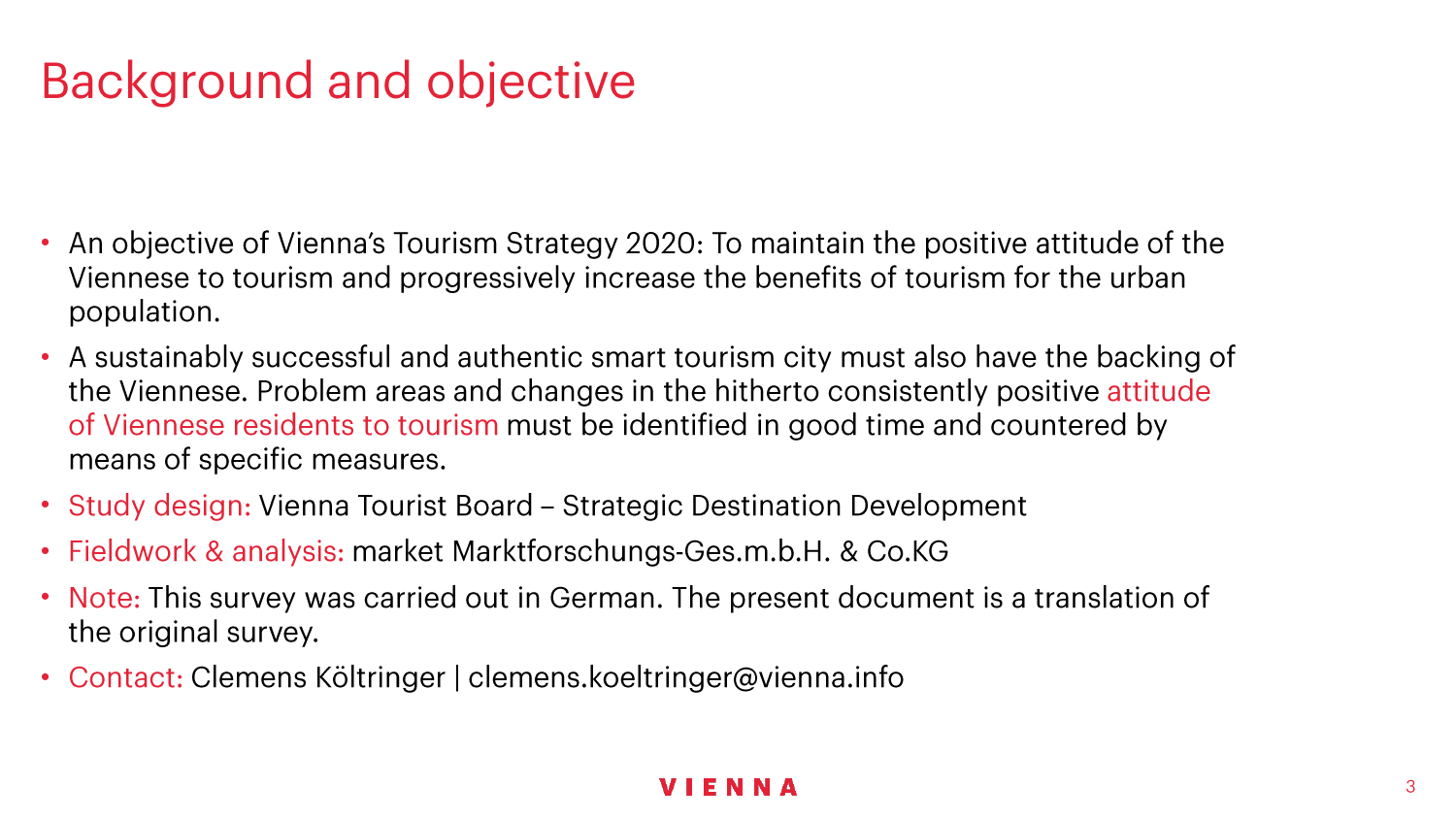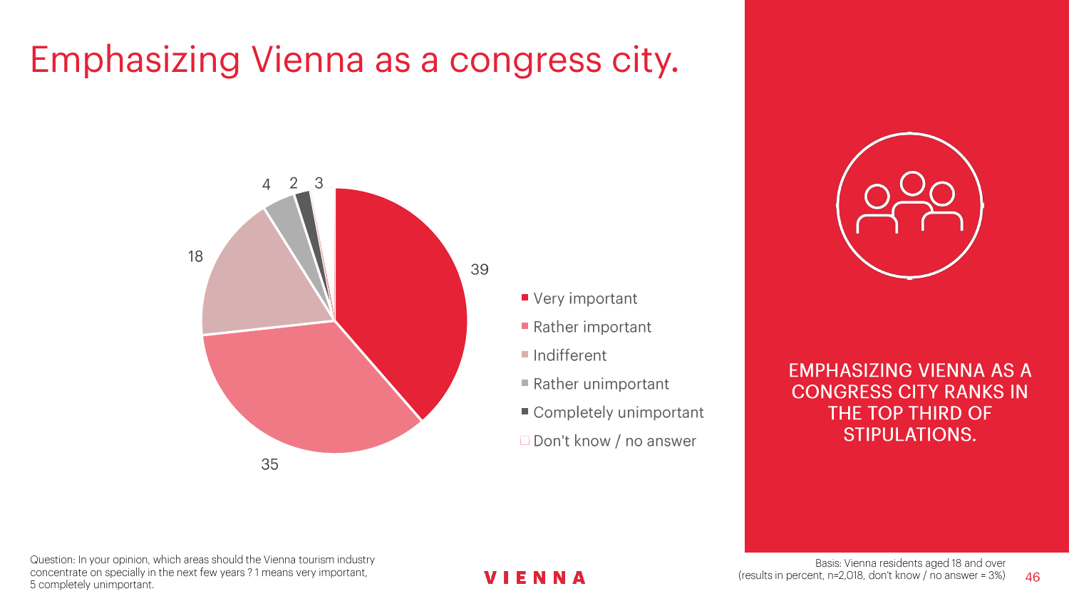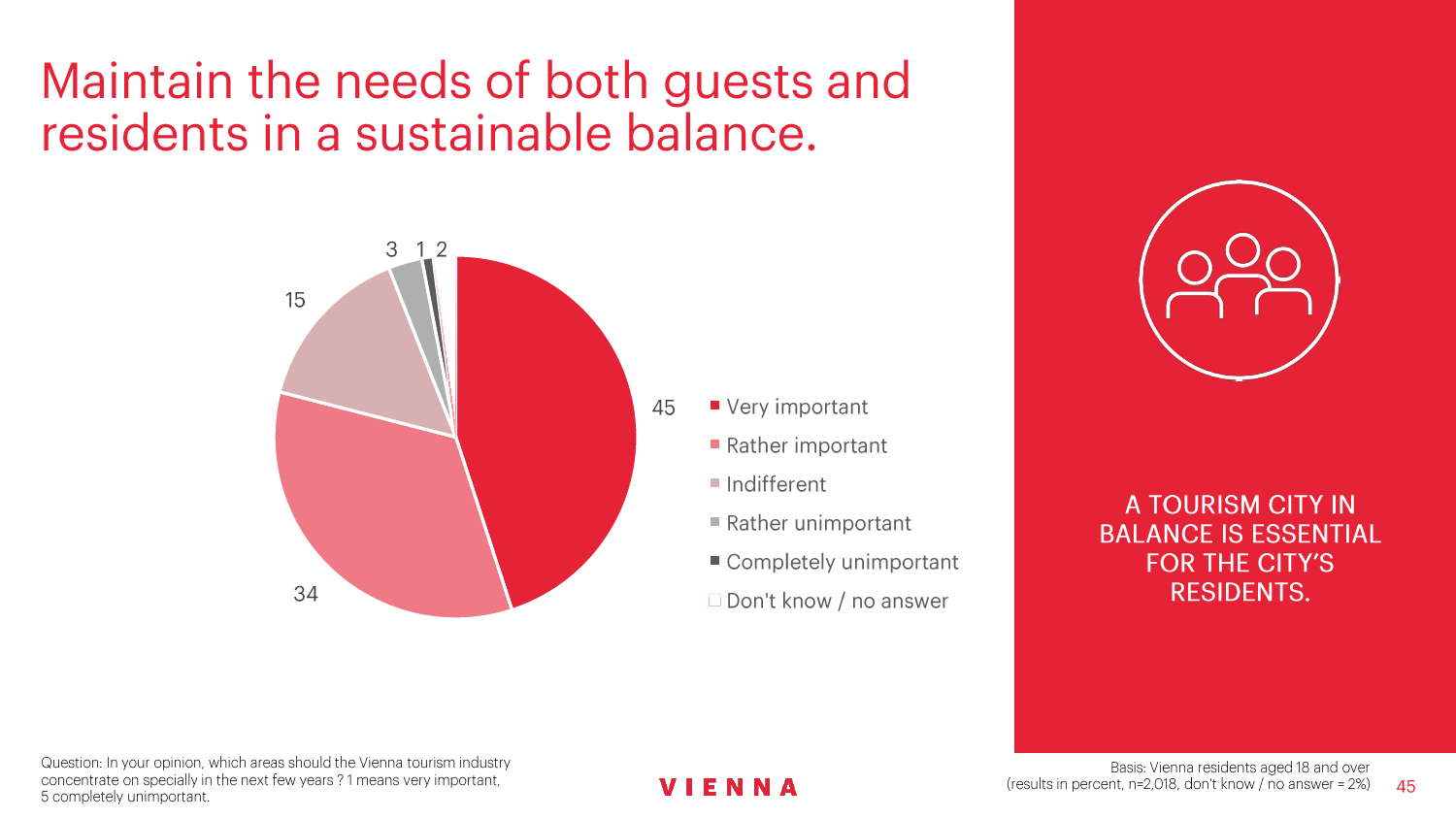 维也纳旅游局一直都在关注维也纳居民对旅游业的态度,以便能够迅速应对事态发展。维也纳旅游局现在还为一门关于城市旅游可持续发展的博士学位课程提供财务上的支持。克特勒对此解释说:“调查结果将会让维也纳和其他欧洲大都会制定具有创新精神的战略。”