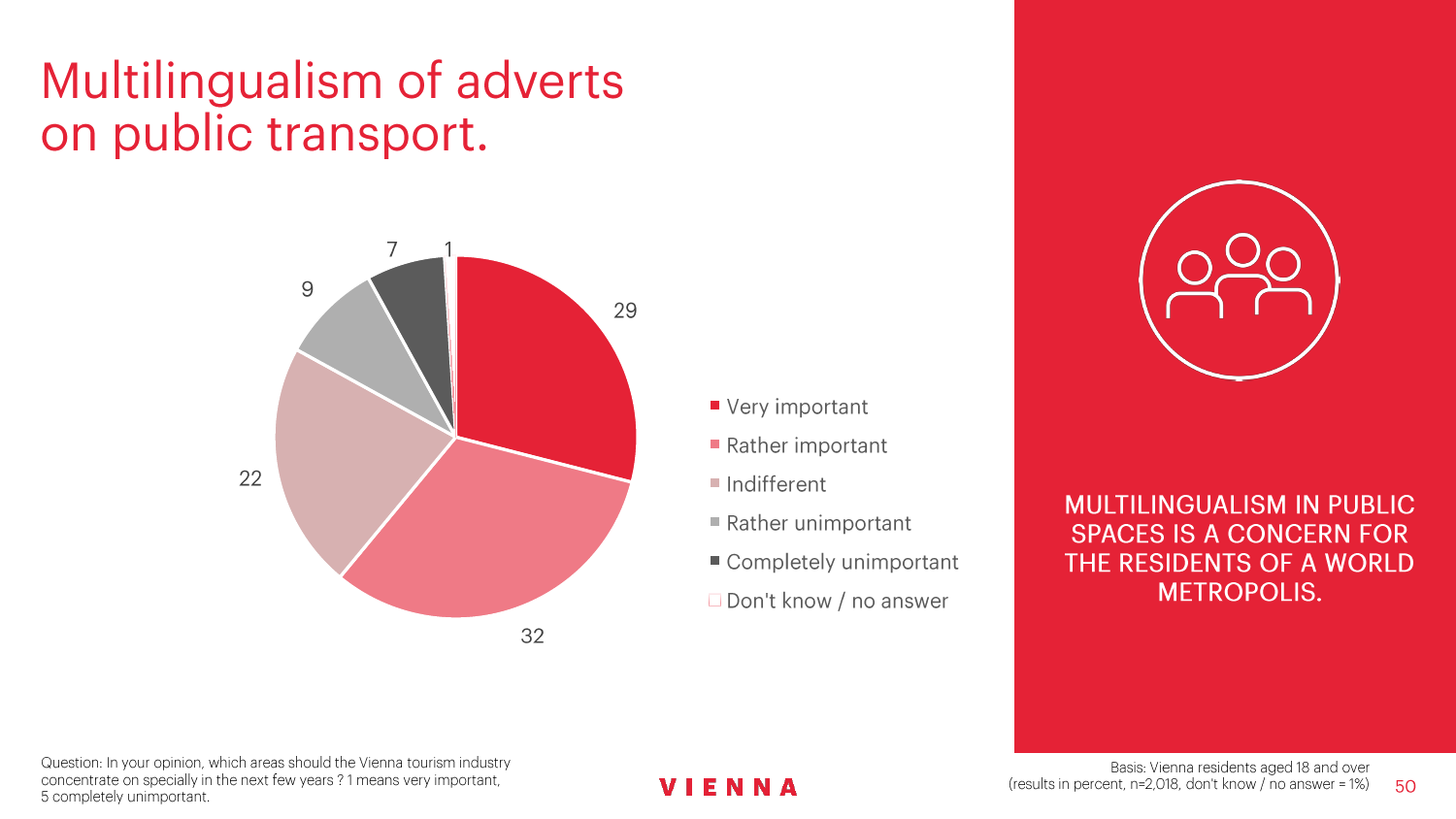 这项具有代表性的调查访问了2000多个维也纳人,在2016年旅游淡季和旺季进行。调查结果显示,与以往的研究相比,尽管游客过夜次数持续上升,但是维也纳人对发展旅游业的积极态度并没有太大的变化。