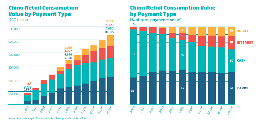 同时中国的线下零售业非现金使用也非常发达。中国银联是线下的主要支付和清算提供商,全国有2670万合作商家,现在中国人均拥有3.1张卡。最新的POS终端都要求植入NFC等技术以支持移动支付功能。