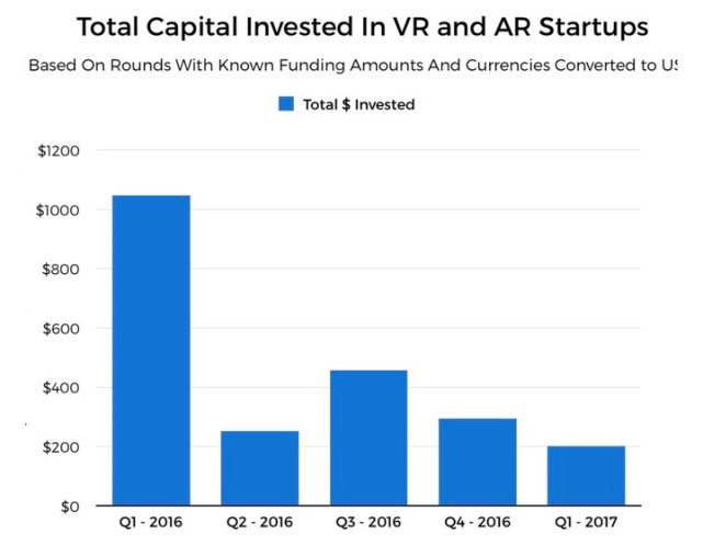据外媒AppleInsider引述市场研究公司Crunchbase的数据报告称,2017年第一季度,全球VR/AR的风险投资额只有两亿美元,相比去年同期的10亿美元,暴跌了80%。