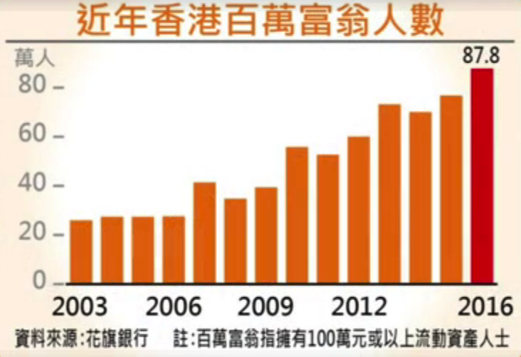 花旗银行19日在港发布的一份报告显示,2016年香港拥有1000万港元或以上流动资产的千万富翁至少有5.9万人,数量与2015年持平。此外,香港拥有百万港元或以上流动资产的人数同比增长14%至87.8万人,创历史新高。