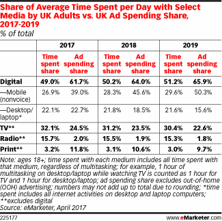 根据eMarketer的最新预测,2017年英国成年人平均每日接触媒体的时间是9小时25分钟,和2012年的1小时16分钟比增长显著。