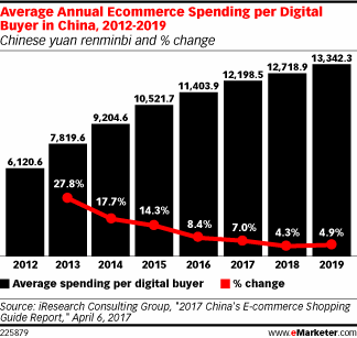 根据2017年4月iResearch Consulting Group的预测,2017年平均每个中国网购消费者的网络购物支出将增长至12198元人民币(1836美元),年增幅7.0%。