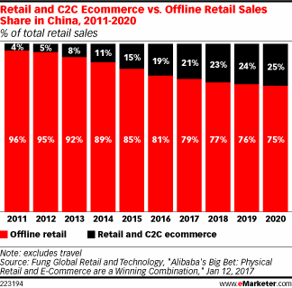 其他机构的数据也支持了这一观点,即中国电子商务销售额极高的增长速度将开始放缓。根据2017年1月Fung Global Retail and Technology的预测数据,今年,中国零售和C2C电子商务销售额份额(21%)将与去年持平,到2020年仅增长4个百分点,达到25%。