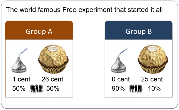 麻省理工学院的行为经济学家用来测试顾客表现的好时实验经常被引用。在这个实验里面,好时和费列罗的巧克力分别有两种不同的价格点。在第一组当中,好时的巧克力是1美分,费列罗的则是26美分。另一组好时是免费的,而费列罗则是25美分。90%的参与者选择了免费的好时巧克力。在驱动顾客采用方面免费似乎具有神奇的魔力。这一结果成为了免费商业模式学派的基石—免费就是免费的营销方式。首先使用免费版来推动对产品的接受、打造大规模的客户群,然后通过推销付费版和附加销售来找到货币化的方式。