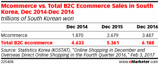 据韩国国家统计局(KOSTAT)表示,2016年12月,韩国移动电商销售额达3.487万亿韩元(约30.8亿美元)。同月,韩国B2C电商销售总额达6.188万亿韩元(约54.7亿美元)。这就意味着,该国移动电商销售额占B2C电商销售额的比例超过了50%。