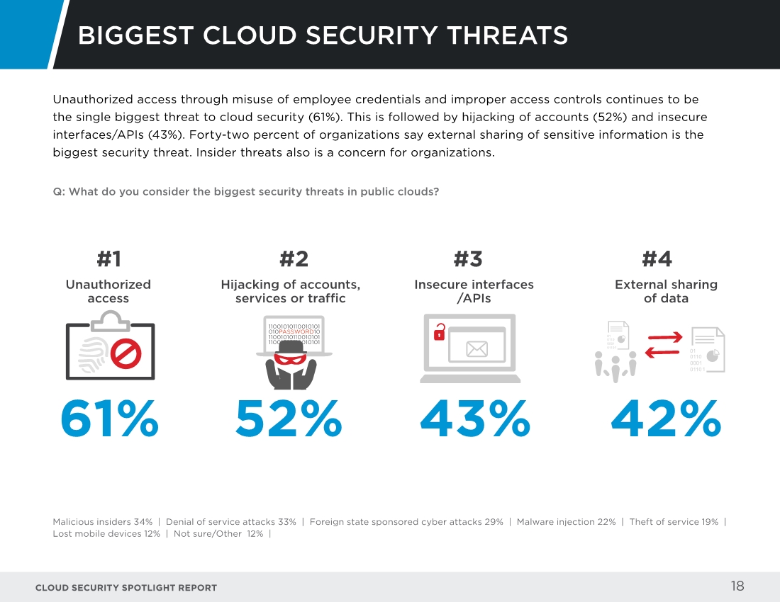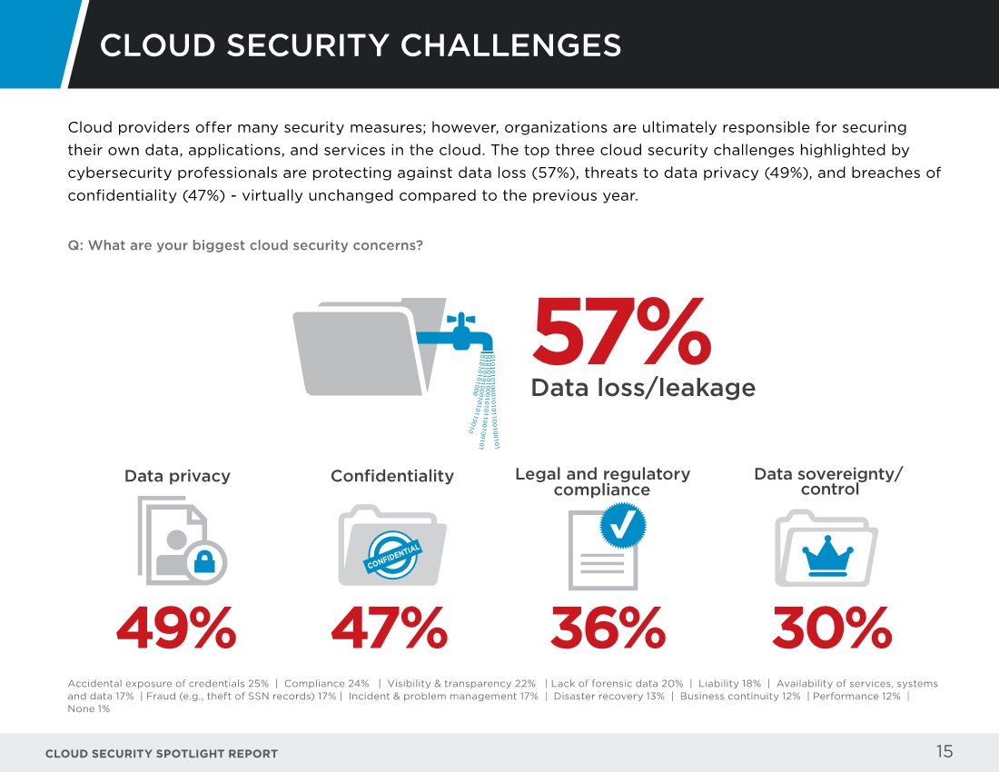 虽然云计算已经成为应用、服务和基础设施的主流交付选择,人们仍然对云计算安全性忧心忡忡。最需要解决的云计算安全问题包括,数据丢失(57%)、数据隐私威胁(49%)和违反保密(47%)。