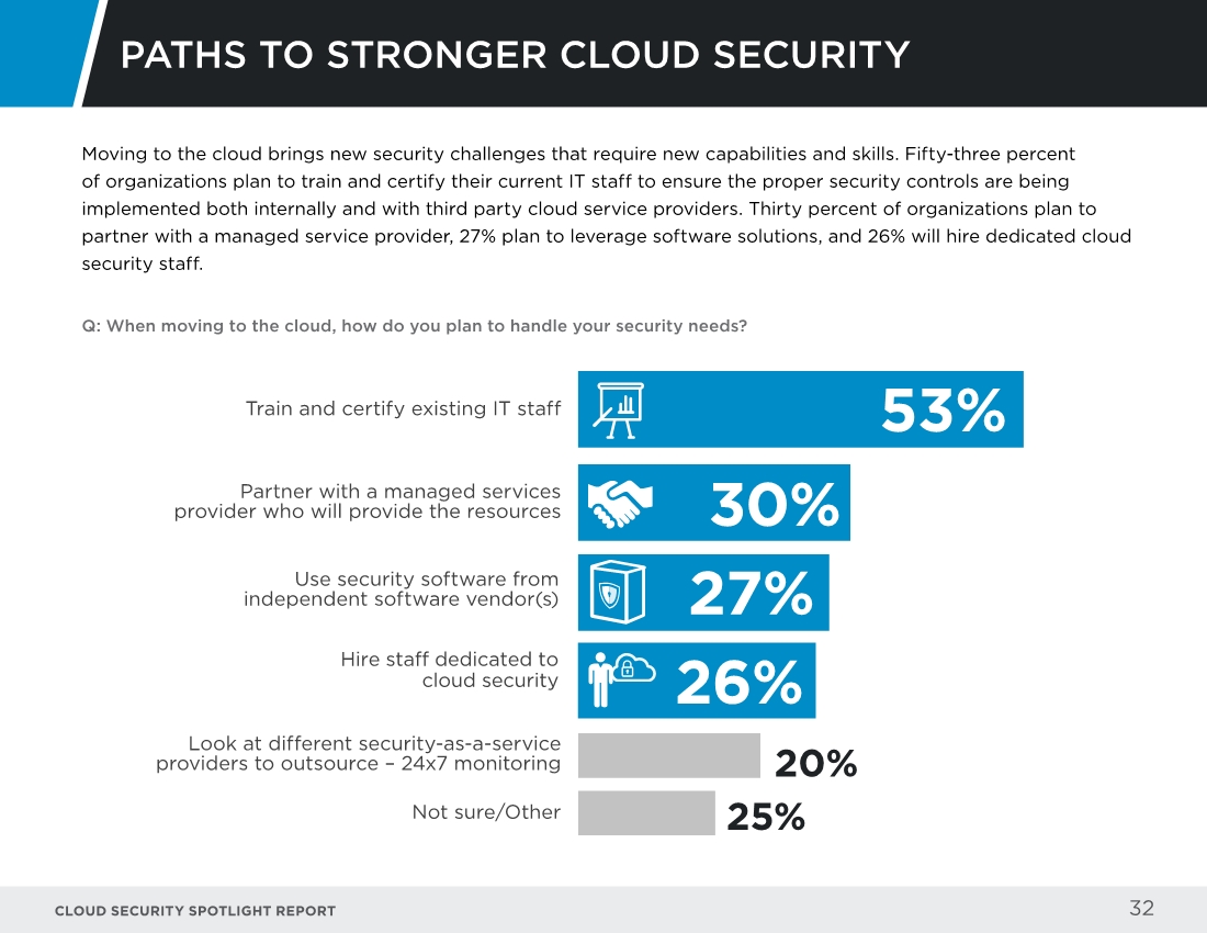 云计算安全挑战需要新技术。为了解决这些安全问题,53%的企业希望对内部IT人员进行培训和认证;30%的企业选择与管理服务提供商合作;其次是利用软件解决方案(27%)或聘用专业人才(26%)。
