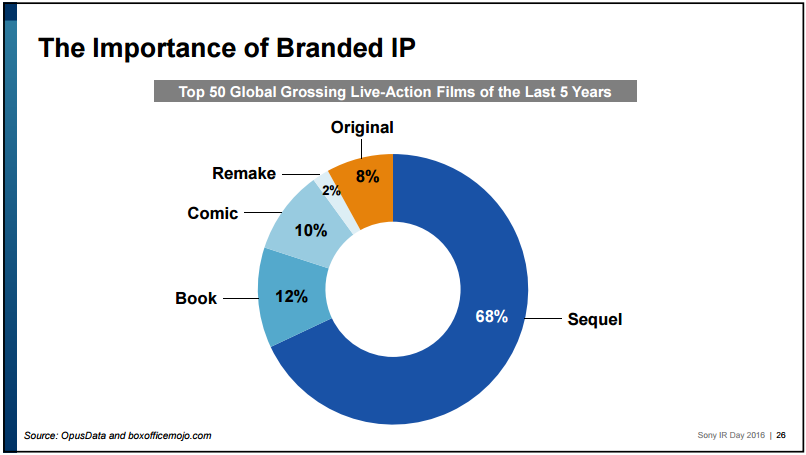 下面这张图可以证明套路(IP)是多么的得人心,在过去5年全球票房50大真人电影中,68%是续集作品,12%来自图书改编作品,10%来自动漫,2%为重制作品,只有8%是完全原创IP。从此数据中可以看出品牌IP的重要性。