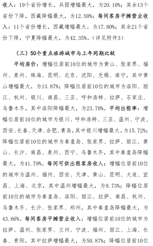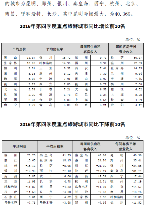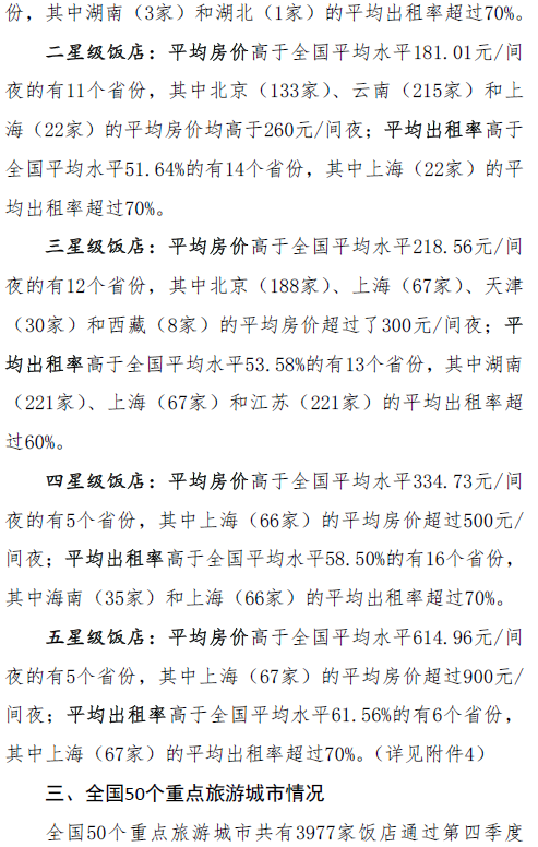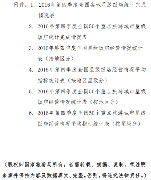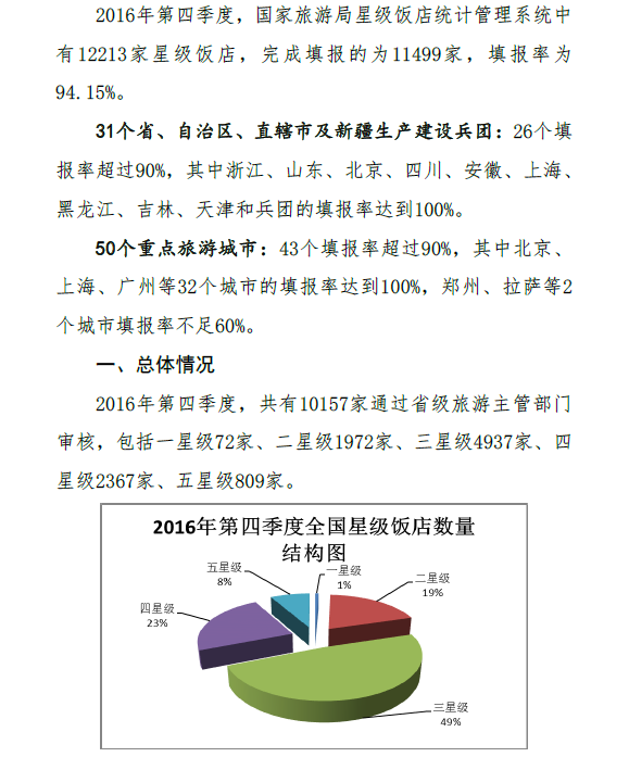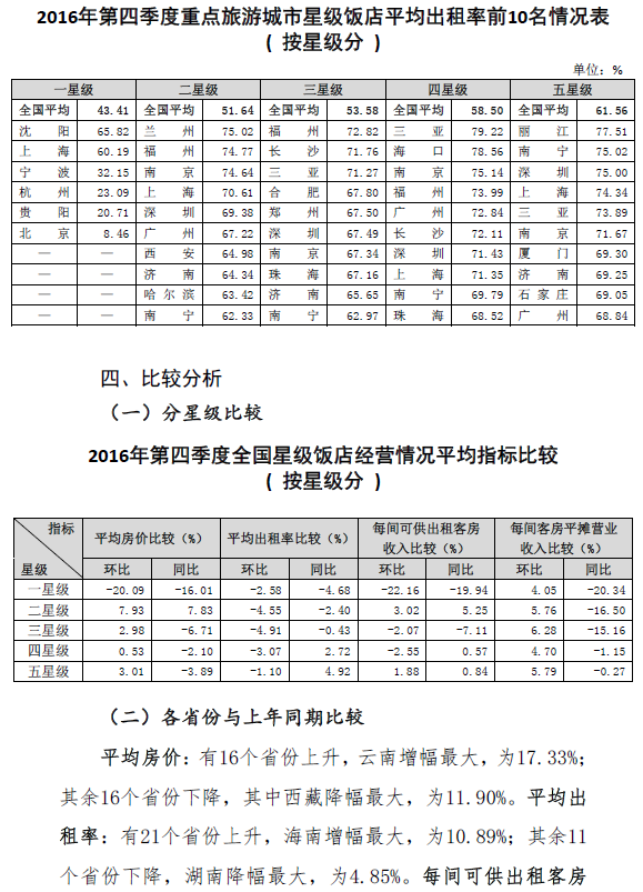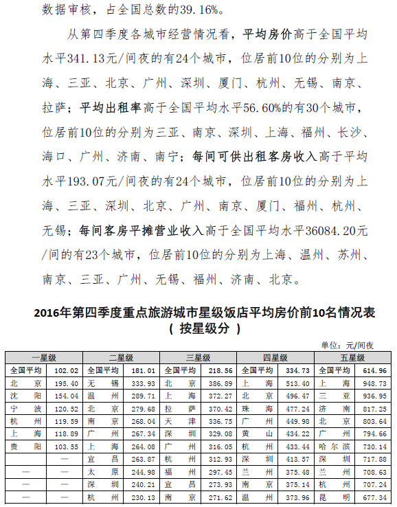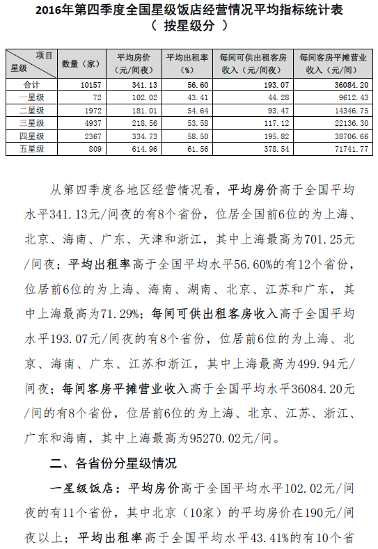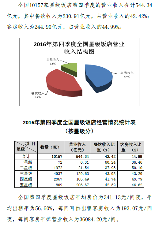 国家旅游局:2016年第四季度全国星级饭店统计公报 近日,国家旅游局发布《2016年第四季度全国星级饭店统计公报》,公报显示全国10157家星级饭店第四季度的营业收入合计544.34亿元,其中餐饮收入为230.91亿元,占营业收入的42.42%客房收入244.90亿元,占营业收入的44.99%。 全国第四季度星级饭店平均房价为341.13元/间夜,平均出租率为56.60%,每间可供出租房收入为193.07元/间夜,每间客房平摊营业收入为36084.20元/间。 更多阅读:国家旅游局:2016年第四季度全国旅行社统计调查情况的公报国家旅游局:2016年上半年旅游统计数据报告国家旅游局:2016上半年中国出境旅游者报告国家旅游局:2015年10月主要旅游客源市场情况国家旅游局:2013年Q4中国星级酒店餐饮客房收入持平国家旅游局:预计2018年春节假日期间国内旅游市场达3.85亿人次 旅游收入4760亿元国家旅游局:2017年国庆中秋假日旅游市场情况总结国家旅游局:2017年10月3日国庆节共接待国内游客1.19亿人次 旅游收入984亿元国家旅游局:2017年10月2日国庆节共接待国内游客1.14亿人次 同比增长9.9%国家旅游局:中国全域旅游厕所导航系统大数据分析报告国家旅游局:2017全域旅游发展报告国家旅游局:2017年 “五一”假期全国共接待游客1.34亿人次 总收入791亿元国家旅游局:2016年2月主要旅游客源市场情况国家旅游局:2016年2月入境旅游情况国家旅游局:2015年1-12月入境外国游客人数(按目的分)