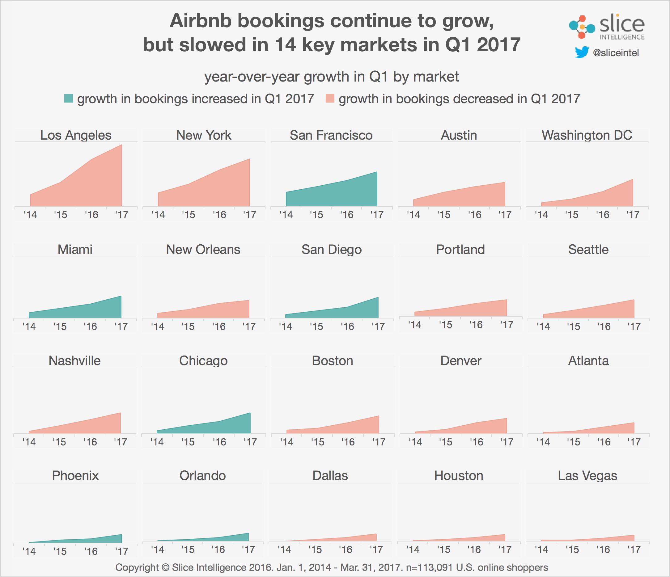 2017年第一季度,Airbnb的短期租赁服务在前20大城市中的14个呈现增长放缓趋势。洛杉矶和纽约等预订订单数量最多的市场受到增长放缓的影响最大。