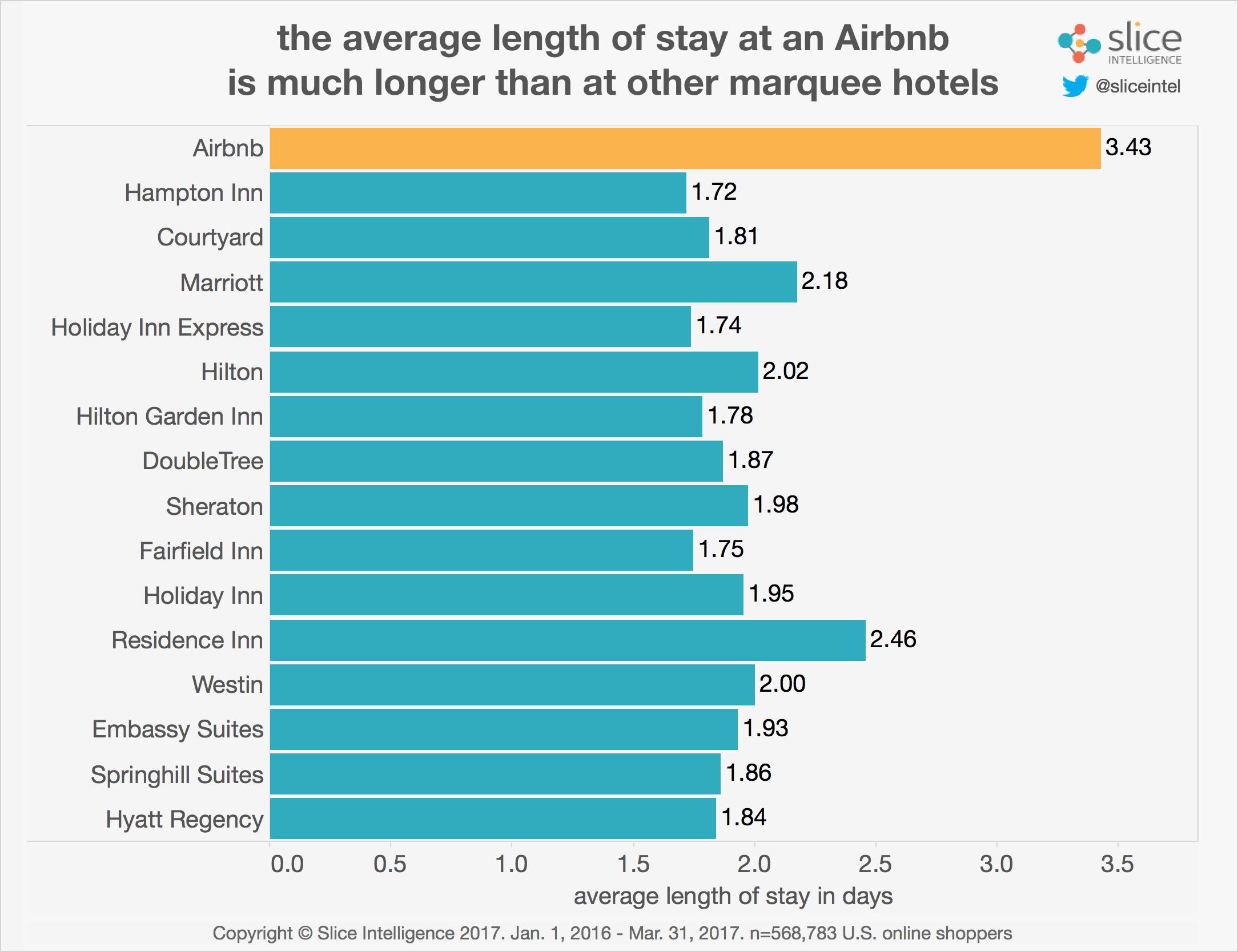 Airbnb的客人比预订传统连锁酒店的客人逗留时间更长。从2016年开始,Airbnb客人平均预订3.4晚的住宿时间。相比之下,普通酒店的客人通常只住两晚。