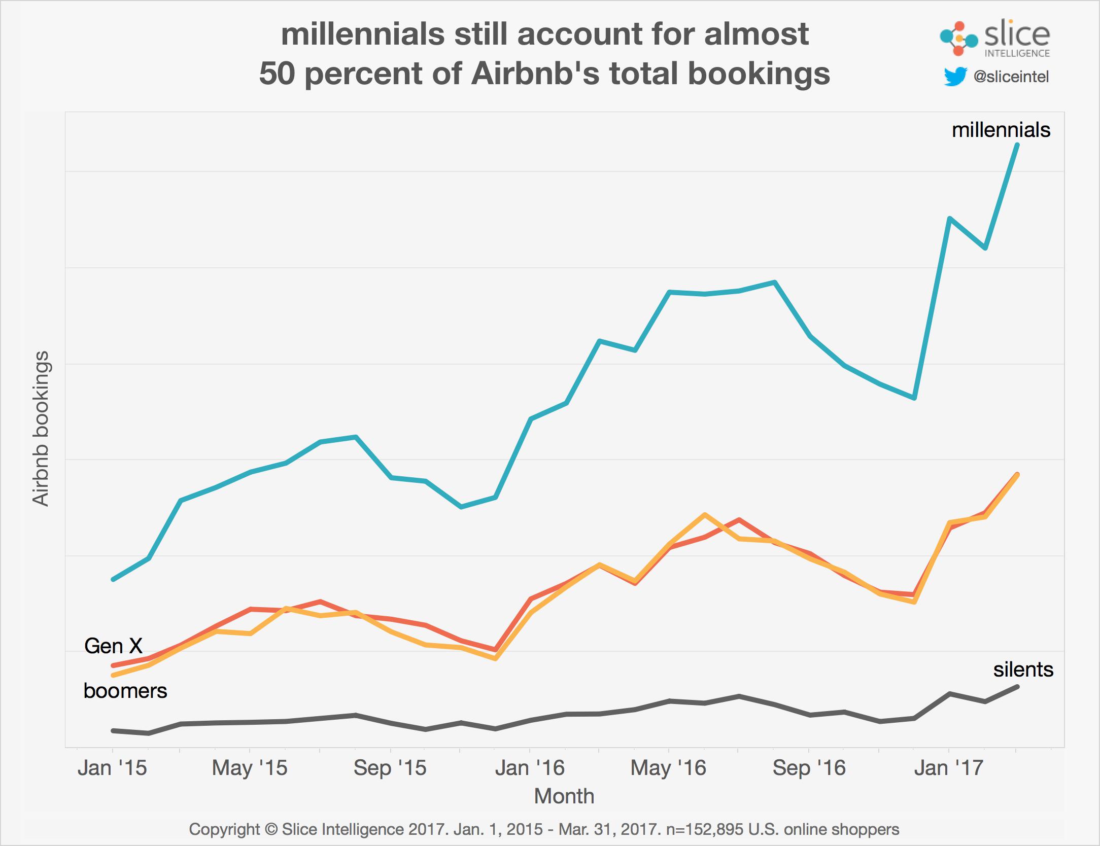 Airbnb的增长继续受到千禧一代的推动。过去一年中,近一半的Airbnb顾客年龄在18至34岁之间。只有29%的在线预订酒店的游客是千禧一代。