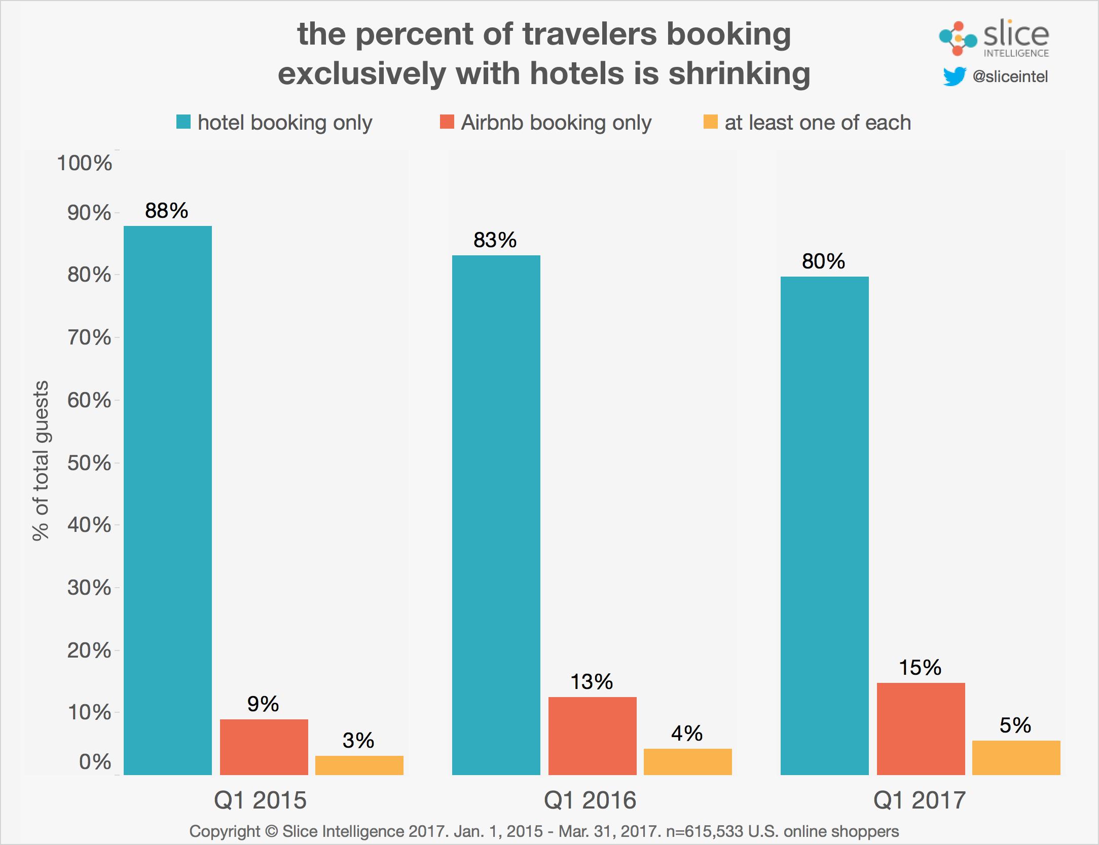 数据显示,大多数旅客仍然选择酒店。过去三个月中,80%的旅客在网上预订了传统的酒店。也就是说,旅行模式的重叠正在增加。过去三个月中,20%的游客选择Airbnb,比2015年第一季度增长了8%。
