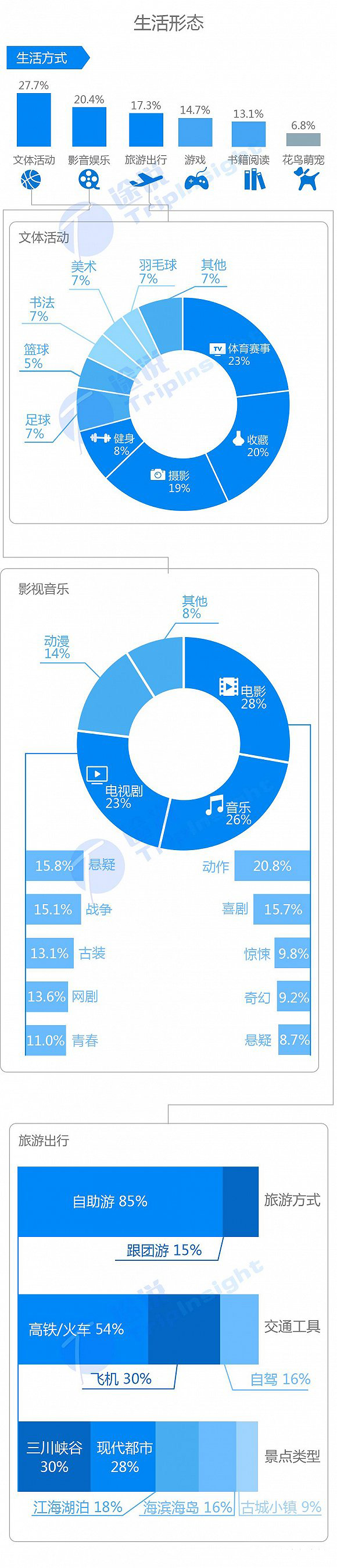 4、旅游出行多为国内自助游,较关注山川、都市景点。