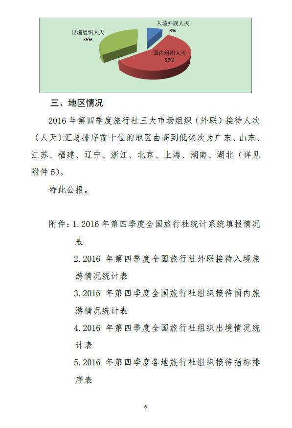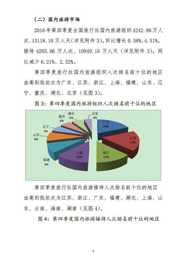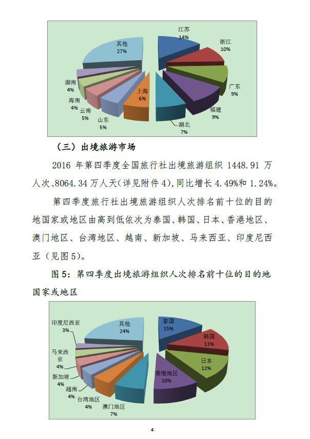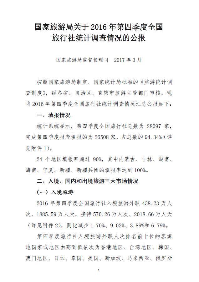 国家旅游局:2016年第四季度全国旅行社统计调查情况的公报 公报显示2016年第四季度全国旅游社入境旅游外联438.23万人次、1885.59万人天,接待570.26万人次、2018.66万人天。 更多阅读:国家旅游局:2016年第四季度全国星级饭店统计公报国家旅游局:2016年2月主要旅游客源市场情况国家旅游局:2016上半年中国出境旅游者报告国家旅游局:2016年上半年旅游统计数据报告国家旅游局:2016年2月入境旅游情况国家旅游局:预计2018年春节假日期间国内旅游市场达3.85亿人次 旅游收入4760亿元国家旅游局:2017年国庆中秋假日旅游市场情况总结国家旅游局:2017年10月3日国庆节共接待国内游客1.19亿人次 旅游收入984亿元国家旅游局:2017年10月2日国庆节共接待国内游客1.14亿人次 同比增长9.9%国家旅游局:中国全域旅游厕所导航系统大数据分析报告国家旅游局:2017全域旅游发展报告国家旅游局:2017年 “五一”假期全国共接待游客1.34亿人次 总收入791亿元国家旅游局:2015年1-12月入境外国游客人数(按目的分)国家旅游局:2015年1-12月来华旅游入境人数(按入境方式分)国家旅游局:2015年1-12月入境外国游客人数(按年龄、性别分)