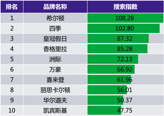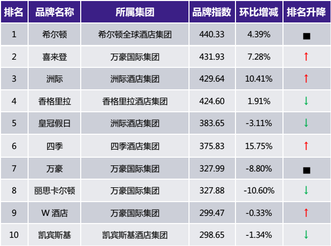 2017年4月,根据迈点研究院(MTA)对国际高端酒店品牌品牌指数的不完全统计,本月国际高端酒店品牌风云榜TOP10依次是希尔顿、喜来登、洲际、香格里拉、皇冠假日、四季、万豪、丽思卡尔顿、W酒店、凯宾斯基。