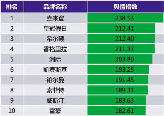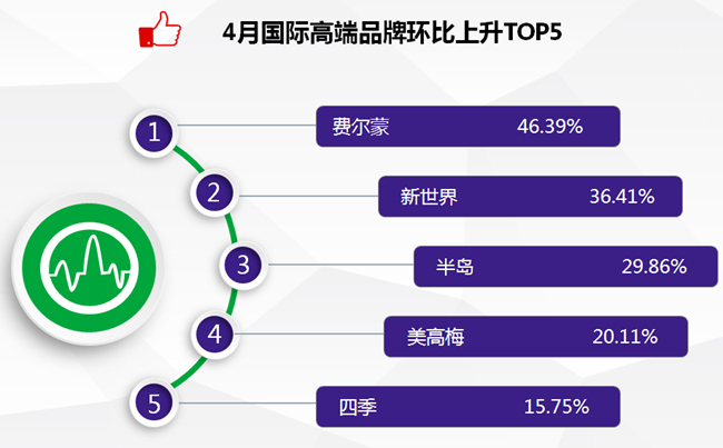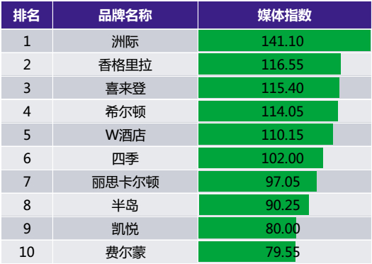 在品牌指数环比增幅方面,费尔蒙以46.39%的增幅位列第一,新世界紧随其后,本月指数环比上涨了36.41%;半岛以29.86%的增幅位列第三;美高梅和四季分列第四和第五,其上升幅度分别为20.11%和15.75%。
