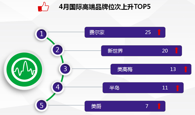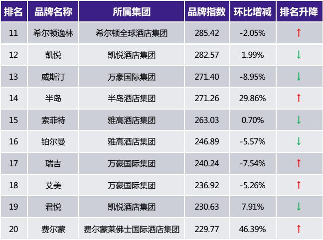 具体来看,名次上升的品牌中,费尔蒙的名次提升最高,达到了25位;新世界其次,本月提升了20个位次;美高梅本月提升了13个位次,位列第三;半岛与美爵分别进步11名和7名,分列上升榜单第四及第五。