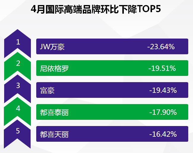综合来看,对比3月,本月指数上升的品牌有26个,指数下降的共有46个。上升幅度在10%以上的有8个品牌,下降幅度在10%以上的有13个品牌。整体而言本月国际高端酒店品牌的品牌指数略有下滑。