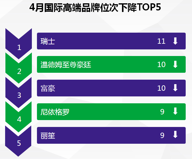 名次下降的品牌中,瑞士下降最多,本月下降了11位,位列第一;温德姆至尊豪廷与富豪紧随其后,本月都下降了10位;尼依格罗与丽笙本月均下降了9个位次,分列第四和第五。