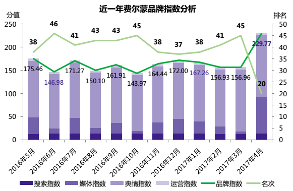 本月表现最亮眼的是费尔蒙。在4月的品牌指数及排名升降榜单中,该品牌都位列第一。4月费尔蒙的品牌指数为229.77,较上月上升46.39%;4月排名第20,较上月上升25个位次。