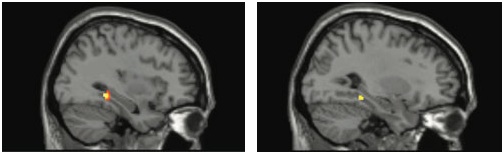携带特殊BDNF基因版本的女性,在进行工作记忆处理时,PET扫描图像(左)和fMRI扫描图像(右)都显示了相同的海马体非典型活跃(黄色),这种活跃在正常工作记忆中是一种异常现象。