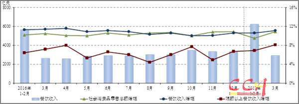 据中国烹饪协会分析,3月份,全国餐饮收入增速较上年同期略降0.3个百分点,限上餐饮收入同比增速上升0.9个百分点,两者环比增幅均大幅提高。1-3月份,全国餐饮收入增速同比滑落0.5个百分点,降幅持续收窄;限上餐饮收入增速同比提升0.6个百分点,大中型餐饮企业发展带动作用强劲。而且,餐饮收入增速继续领跑于社会消费品零售总额。