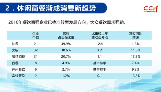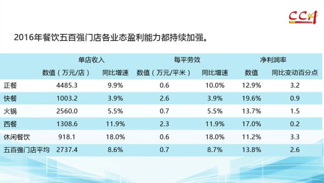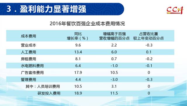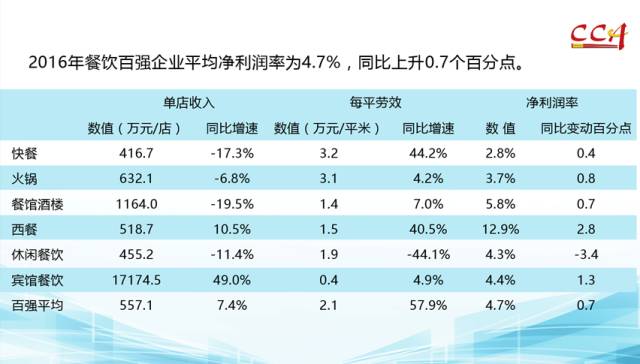 2016年,餐饮百强企业净利润同比劲增28.8%,平均净利润率4.7%,同比上升0.7个百分点;