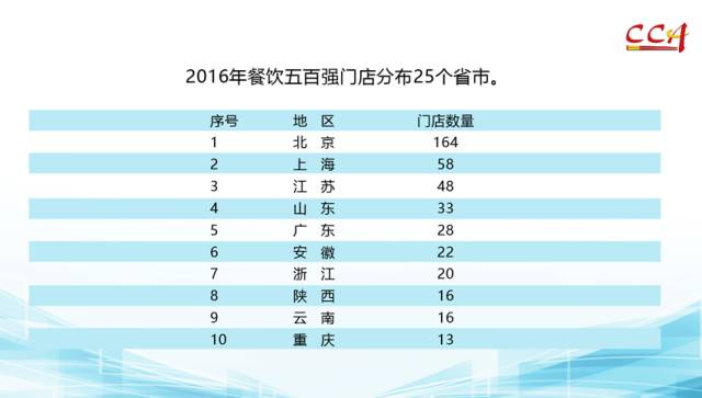 2016年餐饮五百强门店分布于25个省区,有六成集中在北京、上海、江苏、山东4个餐饮产业大省,四大直辖市则占到了48%。