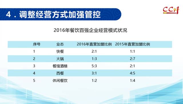 2016年,餐饮百强企业不断进行战略调整,转变经营方式,近30%的企业采取全部直营的方式,还有17%的企业拓展了食品加工业务,建立食品加工基地。