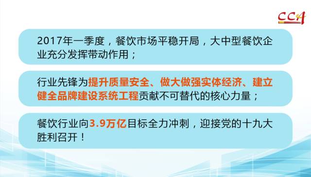 作为行业先锋,餐饮百强企业和餐饮五百强门店要为提升质量安全、做大做强实体经济、建立健全品牌建设系统工程贡献不可替代的核心力量,引领全行业向3.9万亿目标全力冲刺。