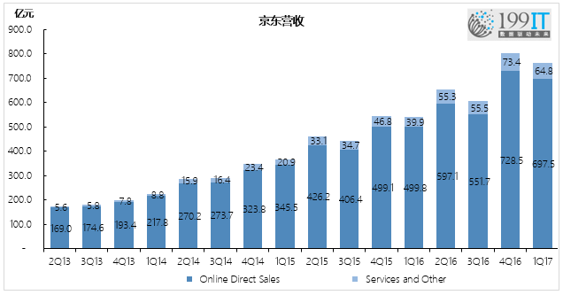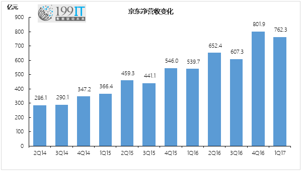 根据京东1Q17最新的财报,京东1季度总计实现净收入为762亿元人民币(约合111亿美元),同比增长41.2%。通用会计准则下净利润为3.56亿元,而基于非美国通用会计准则,净利润为人民币14亿人民币(约合2亿美元)。