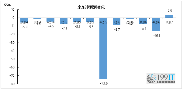 2017年1季度是京东首度实现通用会计准则下盈利,而过去两年京东一共亏损超过120亿元。其中2015年4季度出现比较大亏损的原因是京东停止运营从腾讯接盘的拍拍网带来的相关商誉和无形资产减值、以及本季度对部分投资确认的减值。