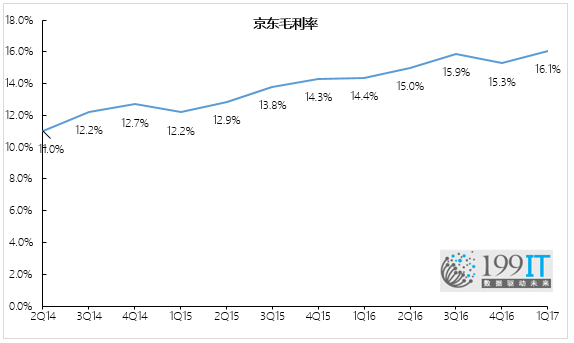 上市以来随着京东开展多元化经营,从全部自营引入第三方商家,从毛利水平低的3C品类扩展至服饰等非3C品类,以及销售额扩展带来的规模效应,京东毛利率逐渐得到改善,从14年2季度的11%上升至2017年1季度的16.1%。其他费用方面,1季度履单费用、市场费用和研发费用分别占营收的比例为7.7%、3.6%和2%,均较去年同期有所下降。
