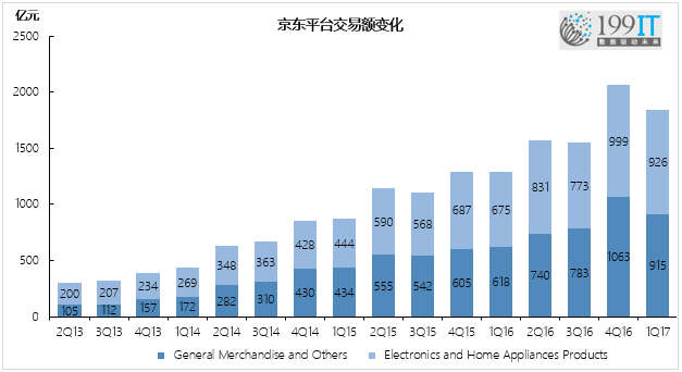 1季度京东平台交易额达到1841亿元,同比增长47%,其中电器和家电同比增长37%至926亿元,日用商品及其他品类商品交易总额为915亿元,同比增长48%,电子与家电业务在京东一季度的交易总额中占据半壁江山。