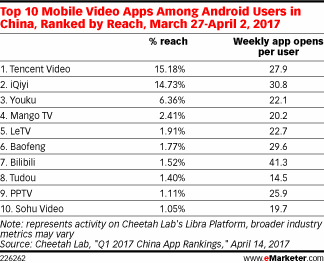 eMarketer预计,2017年中国移动视频观众人数将超过4.35亿。这个巨大的市场加剧了顶级视频应用之间的竞争,因为这些应用都在争取更多的独家内容、用户和流收入。