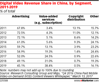 虽然根据iResearch的数据,2011年订阅仅占网络视频收入的3.4%,预计这个比例将在2017年增长至1/4。