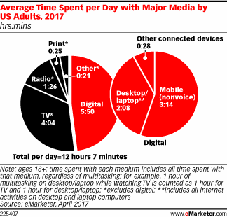 根据eMarketer的最新预测,今年美国成年人平均每天将花超过12个小时访问媒体。