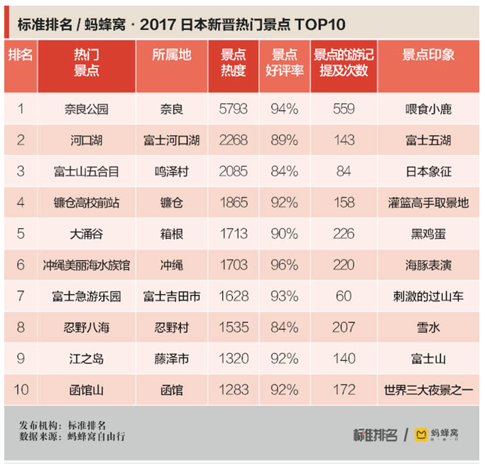 该排名基于蚂蜂窝平台上中国旅行者对日本各个景点的搜索热度、好评率、游记提及次数及景点印象等大数据统计综合得出。榜单显示,奈良公园、河口湖、富士山五合目成为最受欢迎的三大小众景点。
