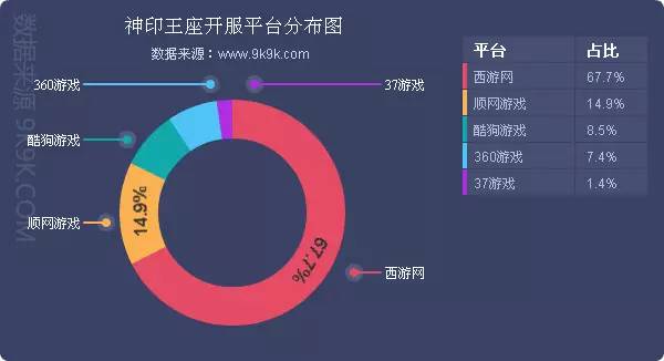 点评:本周《神印王座》开服总数增涨10.6%,其在西游网开服占比高达67.7%。新增分布占比平台37游戏。