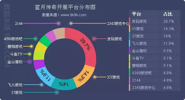 点评:《蓝月传奇》本周开服总数略有增加。新增分布占比平台斗鱼TV、2345游戏中心。