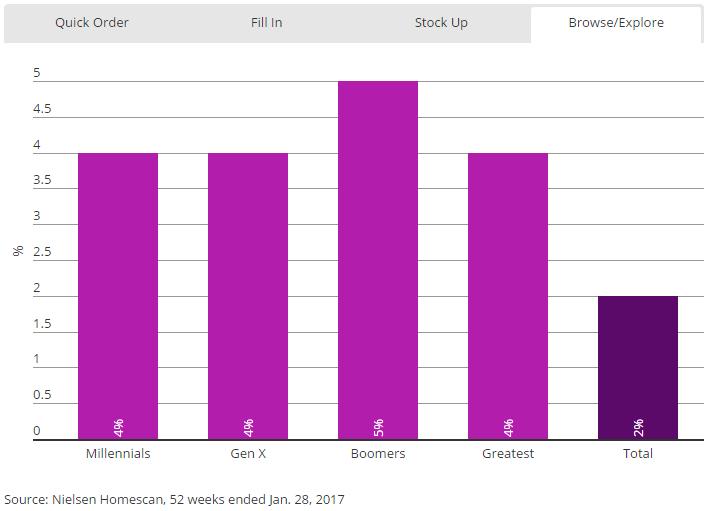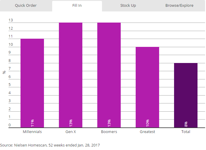 了解促进增长的具体类别将有助于零售商和制造商更好地规划店内和网店的分布。例如,去年电子商务推动美容和个人护理销售额增长10%以上,而实体店销售增长幅度则少得多(美容0.6%,个人护理占1.3%)。宠物护理在网上表现得也很强劲,2016年网络销售额增长16%,占该类商品整体销售额的80%以上。