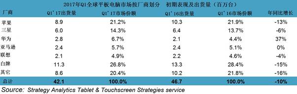 Strategy Analytics:2017年Q1全球平板电脑市场规模下跌10%